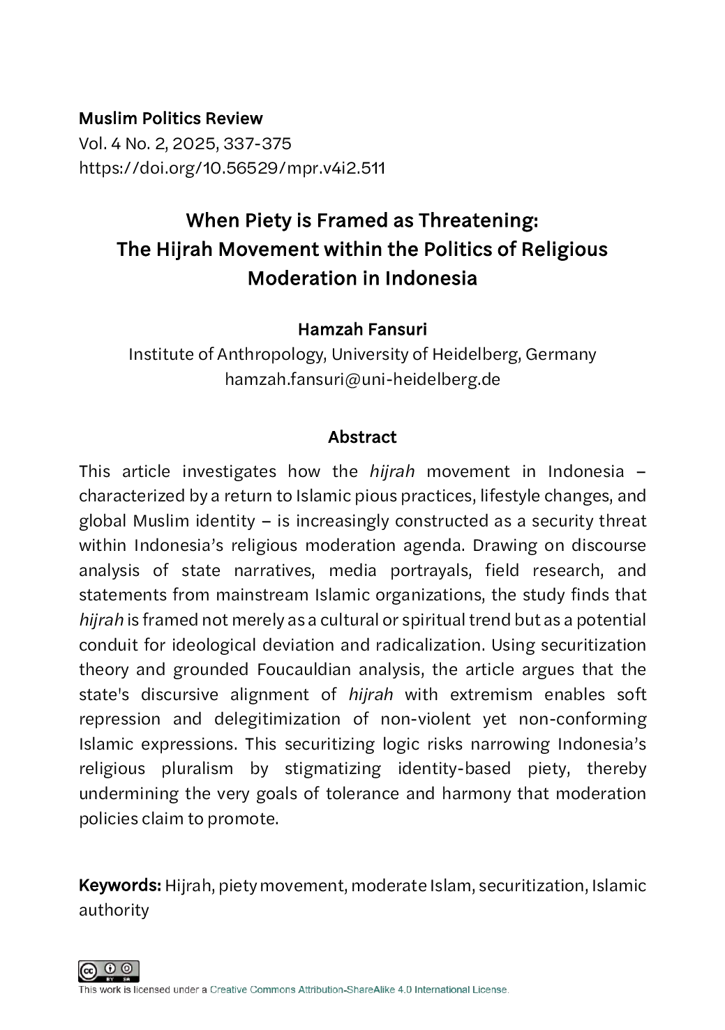 Muslim Politics ReviewMuslim Politics ReviewArtikel ini meneliti bagaimana gerakan hijrah di Indonesia—yang ditandai oleh kembali kepada praktik Islami yang saleh, perubahan gaya hidup, dan identitas Muslim global—semakin dikonstruksi sebagai ancaman keamanan dalam agenda moderasi beragama di Indonesia. Dengan analisis wacana terhadap narasi negara, penyajian media, penelitian lapangan, dan pernyataan organisasi Islam mainstream, studi ini menemukan bahwa hijrah tidak hanya dianggap sebagai tren budaya atau spiritual, tetapi juga sebagai saluran potensial untuk penyimpangan ideologis dan radikalisasi. Menggunakan teori sekuritisasi dan analisis Foucault, artikel ini berpendapat bahwa penyesuaian diskursif negara terhadap hijrah dengan ekstremisme memungkinkan represi lunak dan delegitimasi terhadap ekspresi Islam yang tidak konvensional namun damai. Logika sekuritisasi ini berisiko menyempitkan pluralisme agama di Indonesia dengan mengstigmatisasi kesalehan berbasis identitas, sehingga merusak tujuan toleransi dan keharmonisan yang diklaim oleh kebijakan moderasi.