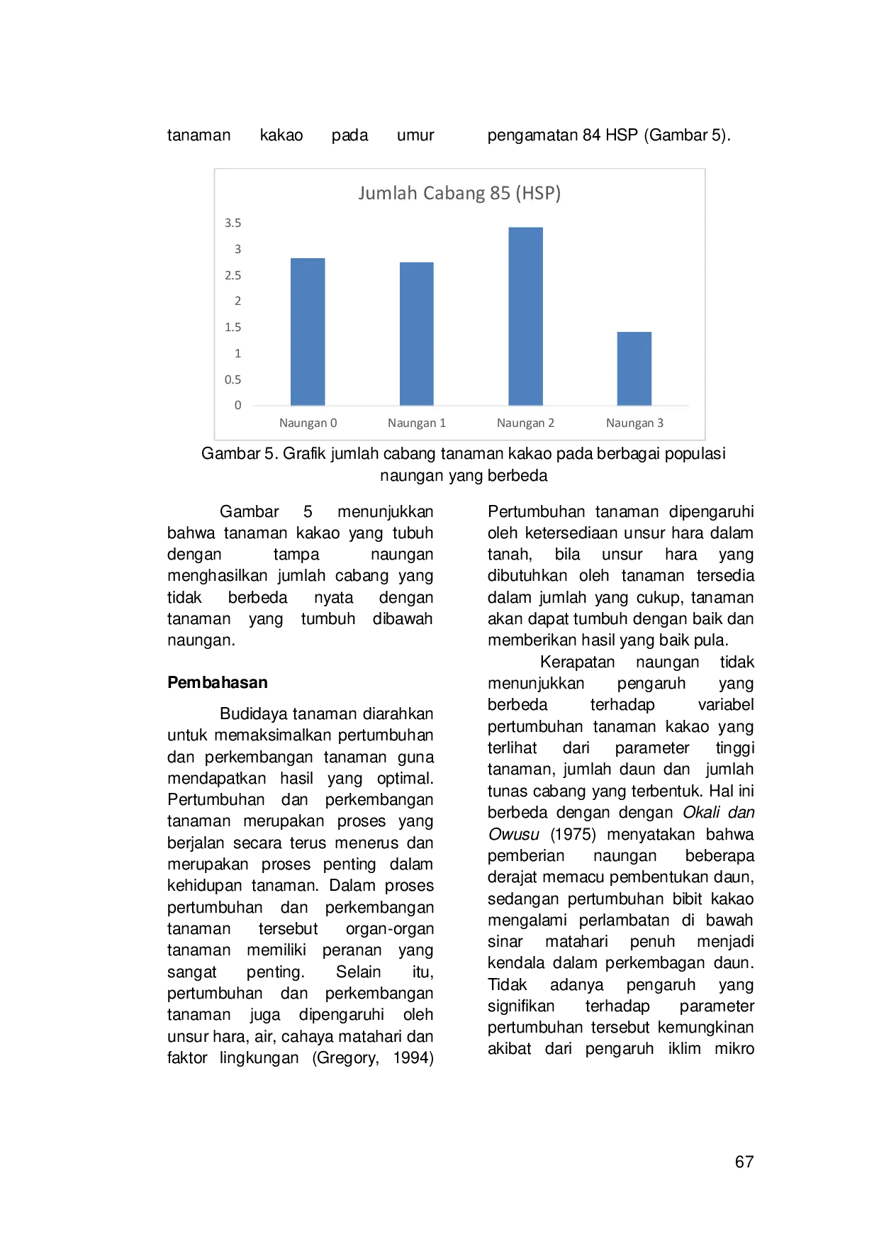 Hasil penelitian disimpulkan bahwa pengaruh naungan tidak berpengaruh nyata terhadap pertumbuhan awal tanaman kakao.Hal tersebut diduga akibat intensitas curah hujan yang tinggi selama penelitian yang menyebabkan iklim mikro dibawah kanopi pohon naungan maupun tanpa kakao yang ternaungi tidak berbeda nyata.Penelitian lanjutan disarankan untuk dilakukan terutama pada musim kemarau guna mendapatkan hasil yang lebih komprehensif.