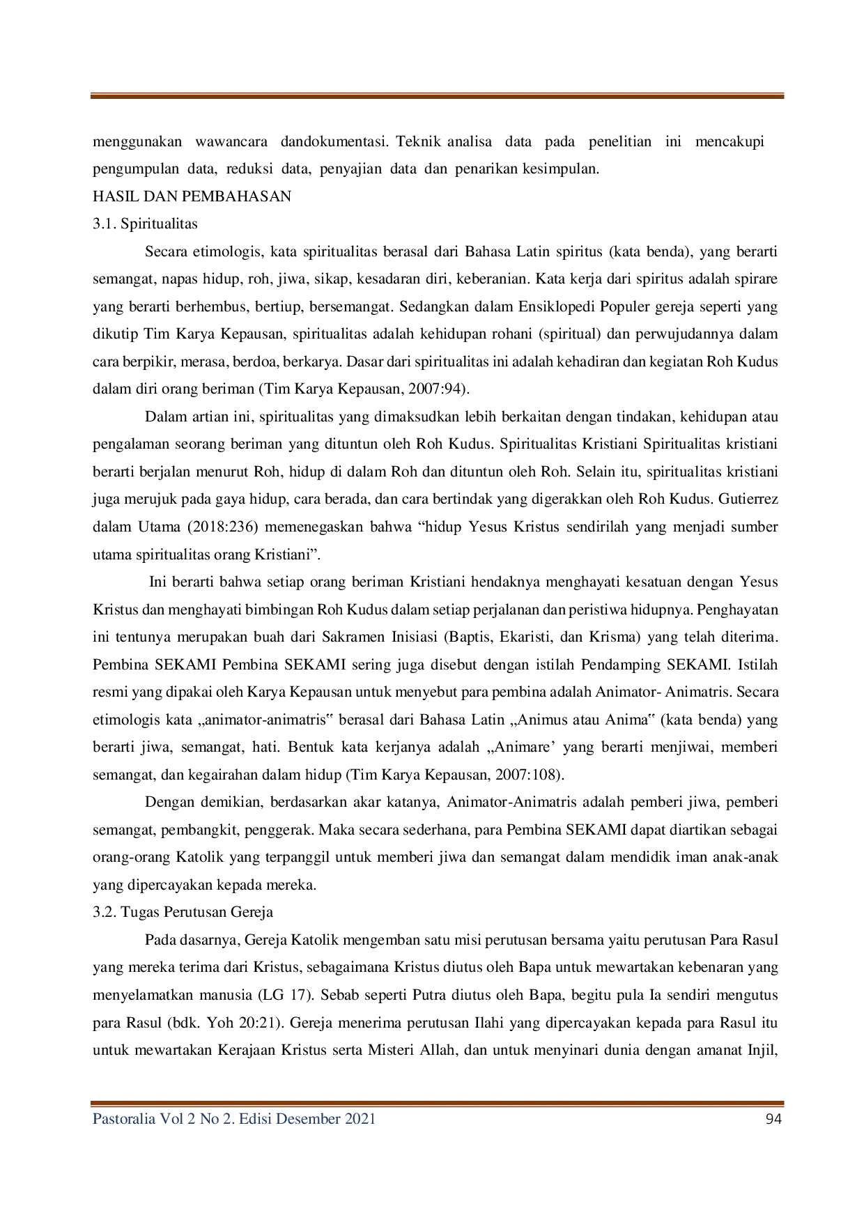 PastoraliaPastoraliaPenelitian ini bertujuan untuk menggali sejauh mana para Pembina SEKAMI Paroki St. Gregorius Agung Oeleta Keuskupan Agung Kupang memahami spiritualitas mereka. Penelitian ini didasari oleh rendahnya keterlibatan aktif para pembina dalam kegiatan SEKAMI, baik selama masa normal maupun pandemi Covid-19. Penelitian ini penting karena Pembina SEKAMI memiliki pengaruh besar terhadap pertumbuhan iman anak selain orang tua dan guru. Penelitian ini menggunakan metode kualitatif dengan teknik pengumpulan data observasi dan wawancara terhadap enam orang Pembina SEKAMI.