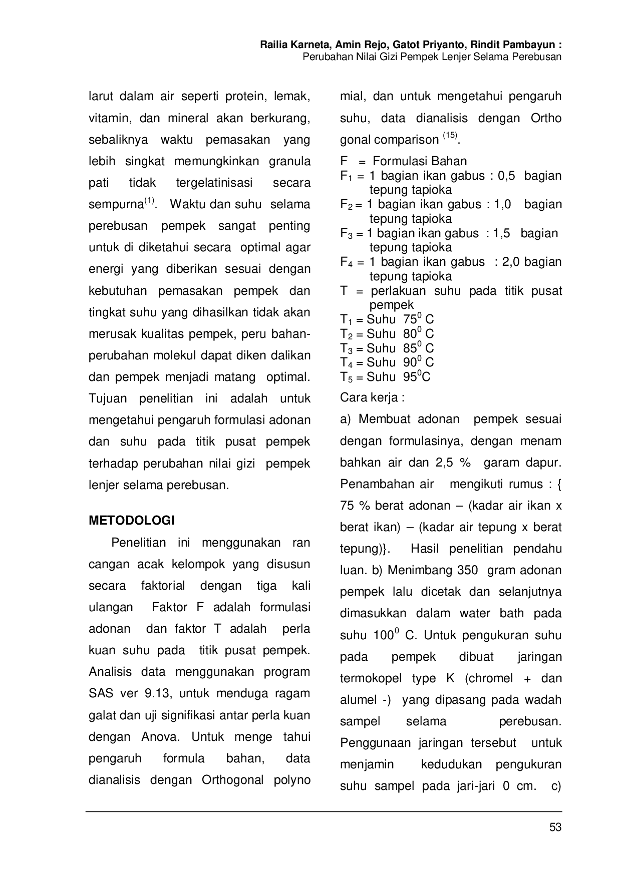Publikasi Penelitian Terapan dan KebijakanPublikasi Penelitian Terapan dan KebijakanPemasakan pempek lenjer dilakukan dengan cara perebusan, yang bertujuan agar tepung tapioka (pati) mengalami proses gelatinisasi, sehingga granula pati mengembang dan protein terdenaturasi. Lama dan tingginya suhu pada proses perebusan pempek harus dikendalikan karena mempengaruhi nilai gizi pempek. Tujuan penelitian ini untuk melihat pengaruh formula dan suhu pada titik pusat terhadap . Perlakuan dengan empat taraf formula adonan dan lima taraf perlakuan suhu. Hasil penelitian menunjukkan bahwa semakin tinggi penambahan tepung tapioka, maka kadar air, kadar protein, kadar lemak dan kadar abu semakin turun, tetapi kadar karbohidrat dan kadar serat semakin tinggi. Kadar air tertinggi pada suhu di titik pusat pempek 950C, kadar protein, kadar lemak, kadar karbohidrat, kadar abu, dan kadar serat tertinggi pada suhu di titik pusat pempek 750C.