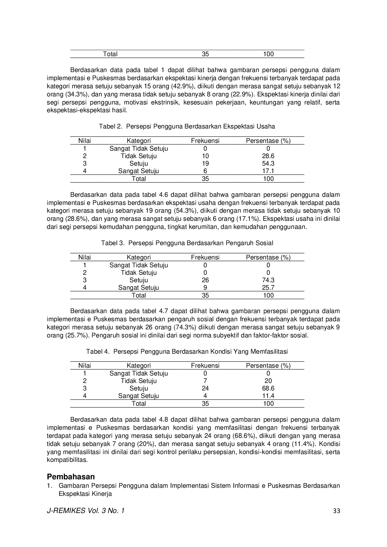Secara keseluruhan, persepsi pengguna terhadap implementasi sistem informasi ePuskesmas di Puskesmas Cijulang berada dalam kategori setuju.Hal ini terlihat dari persetujuan pada aspek ekspektasi kinerja sebesar 42,9% dan ekspektasi usaha sebesar 54,3%.Selain itu, pengguna juga menunjukkan persetujuan yang tinggi pada aspek pengaruh sosial (74,3%) dan kondisi yang memfasilitasi (68,6%).