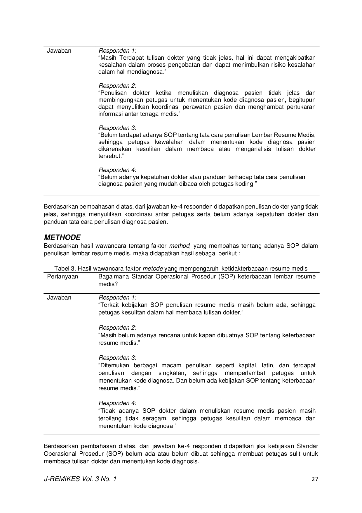 Jurnal Rekam Medis dan Informasi KesehatanJurnal Rekam Medis dan Informasi KesehatanKeterbacaan resume medis merupakan indikator kualitas berkas rekam medis. Faktor yang menyebabkan ketidakterbacaan termasuk kebiasaan dokter menulis diagnosa secara terburu-buru, tidak ada kebijakan atau prosedur yang mengatur penggunaan huruf kapital, dan penggunaan alat tulis yang tidak seragam. Jenis penelitian ini adalah Penelitian Lapangan, dengan metode deskriptif kualitatif. Pengolahan data yang dilakukan yaitu mengolah data hasil wawancara, observasi, pengamatan peneliti di lapangan, dan hasil studi berkas rekam medis. Berdasarkan kesimpulan yang peneliti ambil terdapat 3M yaitu Man, Methode, dan Money. Faktor Man, masih terdapat kurangnya kerja sama antara dokter dengan tenaga kesehatan dan kurangnya kepedulian terhadap kejelasan tulisan pada lembar resume medis. Faktor Methode, belum seragamnya penggunaan penulisan dan singkatan di resume medis dan belum adanya Standar Operasional Prosedur (SOP) tentang keterbacaan atau penulisan yang benar pada resume medis. Faktor Money, tidak adanya reward dan punishment terhadap tenaga kesehatan yang menyebabkan ketidakterbacaan lembar resume medis. Berdasarkan kesimpulan yang telah ada, kami menyarankan bahwasannya melakukan peningkatan kerjasama antara dokter dan tenaga kesehatan lainnya, melakukan keseragaman penulisan dan singkatan pada lembar resume medis, serta diadakannya reward dan punishment bagi tenaga kesehatan yang melakukan pengisian lembar resume medis, dan merencanakan adanya Standar Operasional Prosedur (SOP) tentang penulisan lembar resume medis.