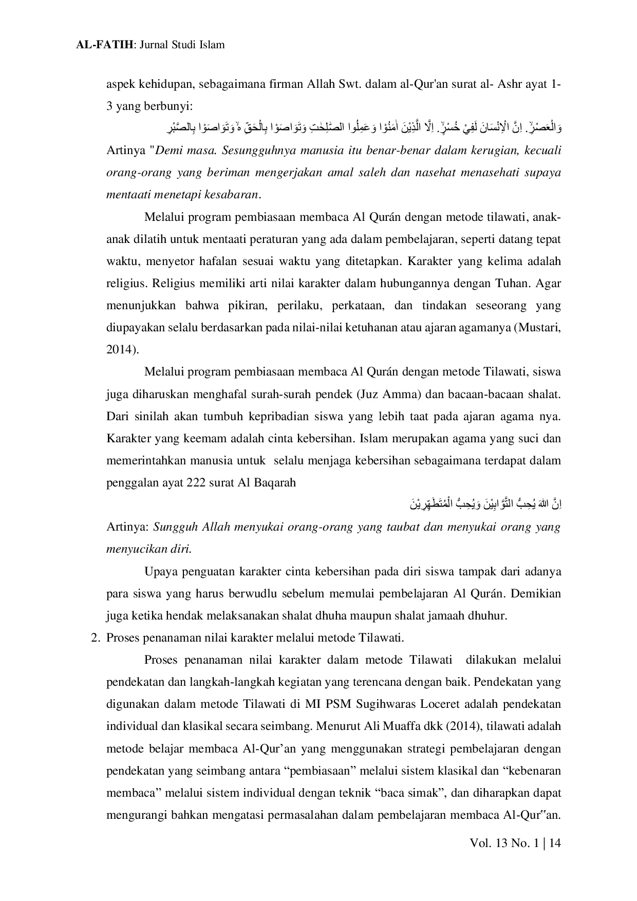 Kesimpulan dari penelitian ini adalah karakter memiliki peranan yang besar dalam membangun peradaban manusia.Oleh karena itu, pendidikan karakter pada anak harus dimulai sejak dini, baik di lingkungan keluarga, maupun di lembaga-lembaga pendidikan.Metode Tilawati, dengan pendekatan klasikal dan individual secara seimbang, berhasil mengembangkan karakter siswa seperti demokrasi, kerja keras, istiqamah, disiplin, religius, dan cinta kebersihan.Penerapan metode ini, dengan memanfaatkan lembar peraga dan teknik baca simak, menumbuhkan karakter positif pada siswa.