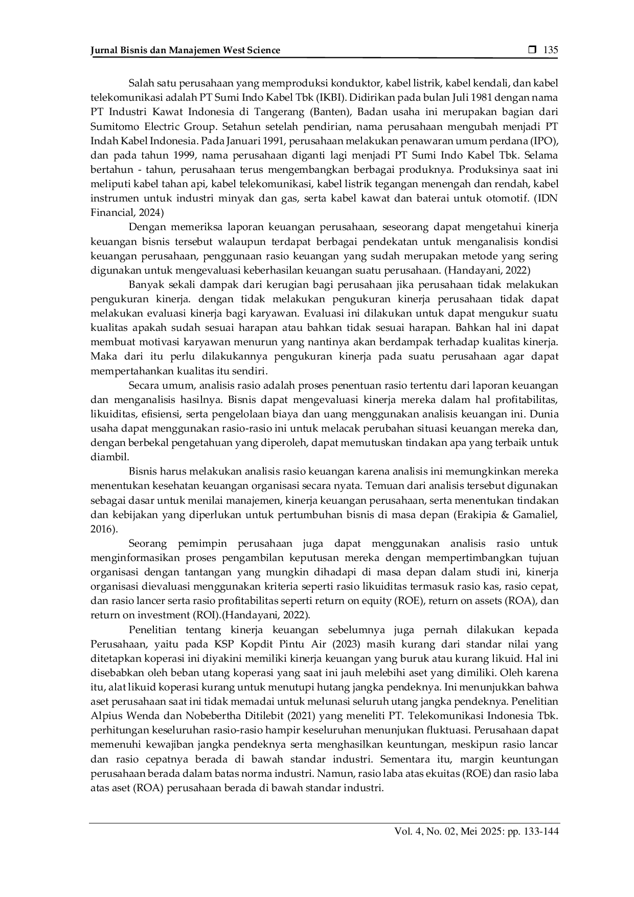 Jurnal Bisnis dan Manajemen West ScienceJurnal Bisnis dan Manajemen West SciencePenelitian ini bertujuan untuk menganalisis kinerja keuangan dengan menggunakan rasio likuiditas dan profitabilitas pada PT Sumi Indo Kabel Tbk. selama periode 2019 sampai dengan 2023. Rasio likuiditas, seperti Current Ratio, Quick Ratio, dan Cash Ratio digunakan untuk mengevaluasi kemampuan perusahaan dalam memenuhi kewajiban jangka pendeknya. Sementara itu, rasio profitabilitas, seperti Return on Assets (ROA), Return on Investment (ROI) dan Return on Equity (ROE), dianalisis untuk mengukur kinerja perusahaan dalam menghasilkan laba. Temuan penelitian menunjukkan bahwa aspek likuiditas perusahaan, tergantung pada kondisi bisnis saat ini, dapat memberikan gambaran yang lebih mendalam tentang kinerja keuangan PT Sumi Indo Kabel Tbk. Hasil analisis menunjukkan bahwa rasio likuiditas PT Sumi Indo Kabel Tbk. Menunjukan kondisi yang sangat baik yang disebabkan oleh peningkatan pinjaman bank dan pinjaman perusahaan. Di sisi lain, rasio profitabilitas menunjukkan peningkatan yang sangat kurang baik, Hal tersebut karena adanya kondisi yang tidak terduga yaitu laba sehingga pandemic COVID-19 yang berpengaruh pada kerugian. Temuan serinngkali mengalami perusahaan mengindikasikan bahwa PT Sumi Indo Kabel Tbk. Memiliki kinerja keuangan yang sangat baik dan mampu mempertahankan likuiditas namun meiliki kinerja keuangan yang sangat tidak baik dalam mengoptimalkan profitabilitasnya. Penelitian ini memberikan wawasan yang berguna bagi manajemen perusahaan dalam pengambilan keputusan keuangan serta bagi para investor dalam mengevaluasi potensi investasi di PT Sumi Indo Kabel Tbk.