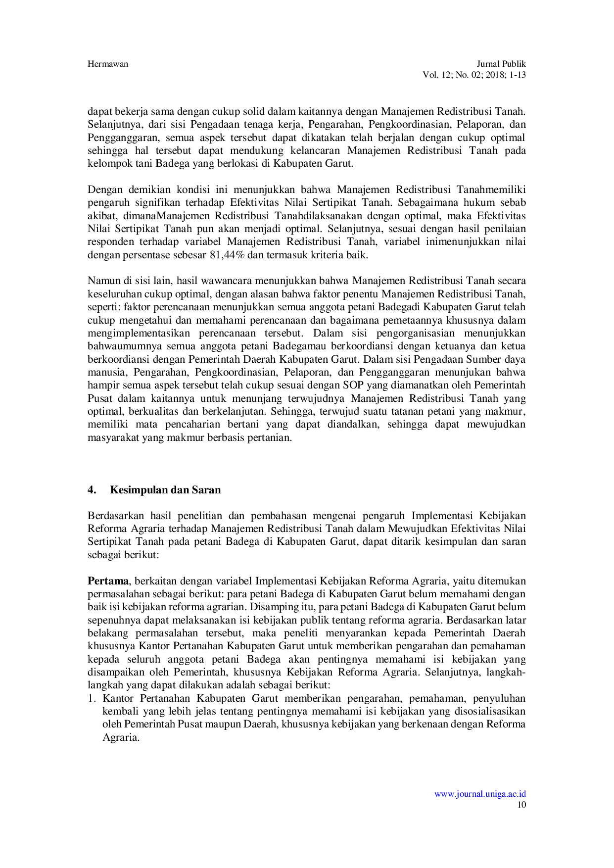 Penelitian ini menyimpulkan bahwa Implementasi Kebijakan Reforma Agraria berpengaruh signifikan terhadap Manajemen Redistribusi Tanah dan Efektivitas Nilai Sertipikat Tanah pada petani Badega di Kabupaten Garut.Implementasi Kebijakan Reforma Agraria juga berpengaruh terhadap Manajemen Redistribusi Tanah, serta Manajemen Redistribusi Tanah berpengaruh signifikan terhadap Efektivitas Nilai Sertipikat Tanah.Dengan demikian, optimalisasi Implementasi Kebijakan Reforma Agraria dan Manajemen Redistribusi Tanah menjadi kunci untuk mewujudkan Efektivitas Nilai Sertipikat Tanah.