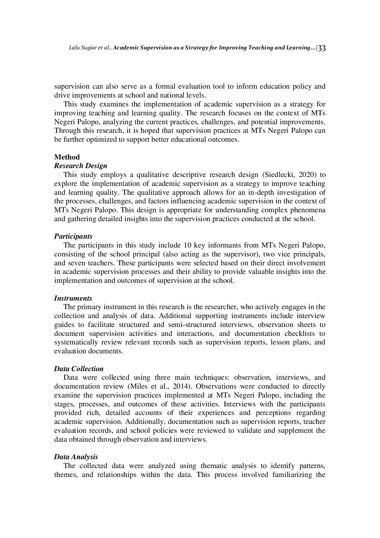 International Journal of Educational Administration, Management, and LeadershipInternational Journal of Educational Administration, Management, and LeadershipStudi ini mengkaji implementasi supervisi akademik sebagai strategi untuk meningkatkan kualitas pengajaran dan pembelajaran di MTs Negeri Palopo. Supervisi akademik secara sistematis melibatkan observasi kelas, umpan balik konstruktif, dan diskusi kolaboratif antara supervisor dan guru untuk meningkatkan pengembangan profesional dan menyelaraskan praktik pengajaran dengan standar kurikulum. Penelitian ini mengidentifikasi kolaborasi yang kuat antara supervisor dan guru, kepemimpinan sekolah yang proaktif, dan penyediaan sumber daya yang memadai sebagai faktor kunci yang berkontribusi terhadap keberhasilan supervisi akademik. Guru secara aktif terlibat dalam pengambilan keputusan dan mendapatkan manfaat dari umpan balik berbasis bukti yang berasal dari data kinerja siswa. Upaya peningkatan kualitas pengajaran dan pembelajaran di MTs Negeri Palopo meliputi program pengembangan profesional guru, penyempurnaan kurikulum, bimbingan manajemen kelas, dan intervensi berbasis data. Inisiatif-inisiatif ini difasilitasi melalui forum internal, pelatihan eksternal, dan dukungan supervisi, memungkinkan guru untuk mengadopsi praktik instruksional inovatif dan mengatasi tantangan kelas secara efektif. Meskipun terdapat keberhasilan ini, tantangan seperti waktu supervisi yang terbatas, resistensi terhadap umpan balik, dan kesenjangan komunikasi sesekali menghambat potensi penuh supervisi akademik. Temuan ini menunjukkan bahwa mengatasi tantangan-tantangan ini melalui peningkatan manajemen waktu, mendorong keterbukaan terhadap umpan balik, dan meningkatkan strategi komunikasi dapat memperkuat dampak positif supervisi terhadap kualitas pengajaran dan hasil belajar siswa. Dengan mengoptimalkan praktik supervisi akademik, MTs Negeri Palopo dapat terus memberikan pendidikan berkualitas tinggi dan berfungsi sebagai model bagi institusi pendidikan serupa.