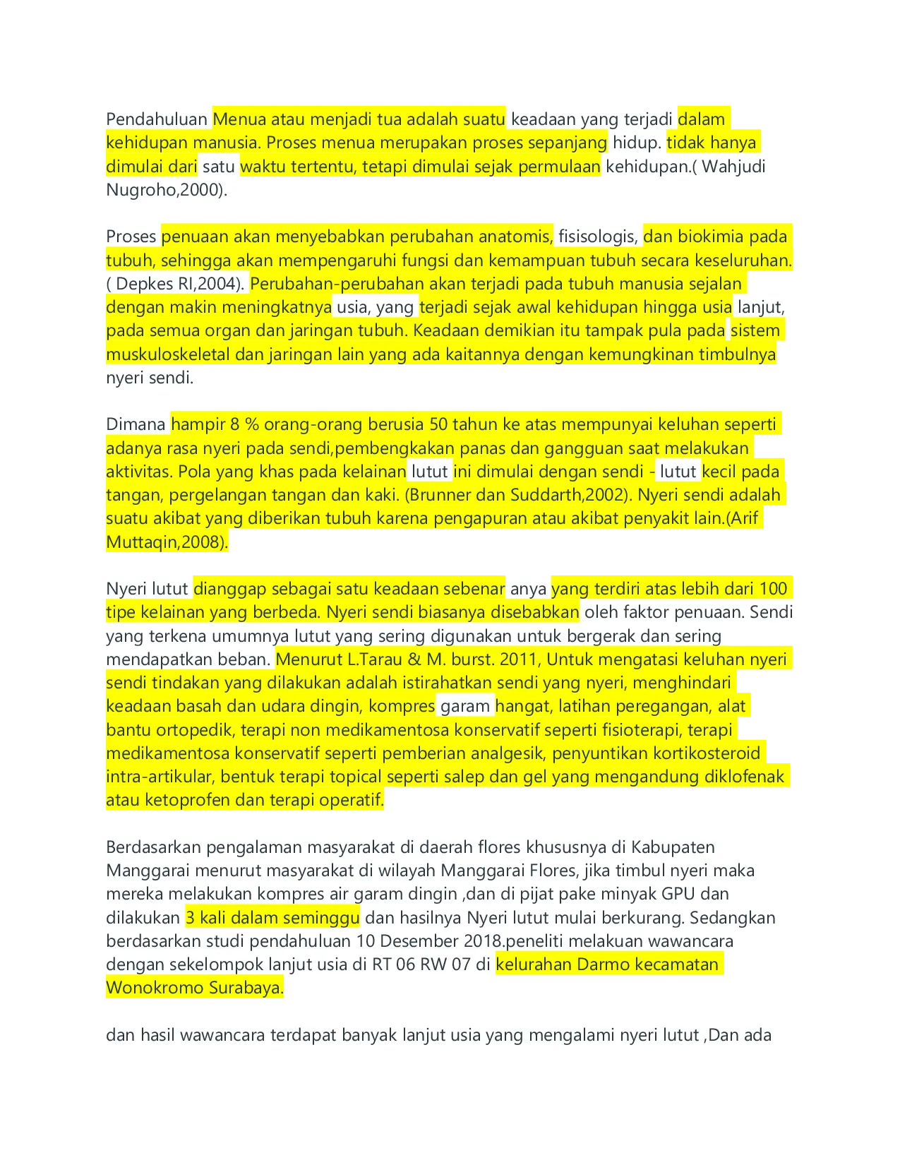 KebKebSetiap orang, apalagi lansia (lanjut usia), tentu pernah merasakan nyeri selama perjalanan hidupnya. Perasaan nyeri ini kualitas dan kuantitasnya berbeda dari satu orang ke orang lain, tergantung dari tempat nyeri, waktu, penyebab dan lain-lain. Nyeri adalah sesuatu hal yang bersifat subjektif, tidak ada dua orang sekalipun yang mengalami kesamaan rasa nyeri. Beberapa terapi nonfarmakologi yang dapat diambil guna membantu mengurangi nyeri sendi pada lansia adalah kompres garam hangat. Penelitian ini bertujuan untuk mengetahui pengaruh kompres air garam hangat terhadap nyeri sendi pada lansia. Metode penelitian ini menggunakan dan menggunakan desain one group pretest-posttest. Variabel independen yaitu terapi dan one group pretest-posttest. Jumlah sampel dalam penelitian ini adalah 13 responden dengan metode consecutive sampling. Analisis data pada penelitian ini menggunakan uji Wilcoxon. Sebelum dilakukan kompres garam hangat di dapatkan skala nyeri sedang 11 lansia (84,6%) sedangkan sesudah dilakukan kompres garam hangat di dapatkan skala nyeri ringan 12 lansia (92,3%) Hasil uji Wilcoxon menunjukan penurunan sebelum dan sesudah intervensi dengan nilai p= 0,000, sehingga ada pengaruh kompres hangat garam krosok terhadap nyeri lutut pada lansia di kelurahan Darmo Kecamatan Wonokromo Surabay .Oleh karena itu penggunaan kompres hangat garam krosok dapat dipakai sebagai alternatif penanganan nyeri sendi pada lutut untuk lansia.