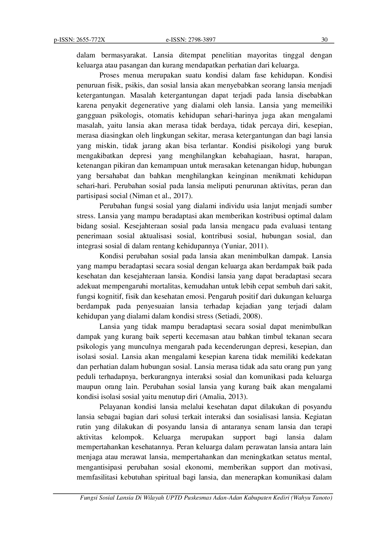 Khatulistiwa Nursing JournalKhatulistiwa Nursing JournalLatar Belakang: Menua adalah kondisi fisiologis yang akan terjadi di seluruh kehidupan manusia. Dimulai sejak permulaan kehidupan. Masa lansia dimaknai sebagai masa kemunduran, di antaranya penurunan fisik, psikis, dan sosial lansia. Perubahan sosial pada lansia meliputi penurunan aktivitas, peran dan partisipasi sosial. Tujuan penelitian Proses menua terjadi sepanjang hidup, tidak hanya dimulai dari suatu waktu tertentu. Tujuan: Tujuan penelitian ini adalah untuk mengetahui bagaimana fungsi sosial lansia di wilayah kerja UPTD Puskesmas Adan-Adan Kabupaten Kediri. Metode: Desain penelitian menggunakan desain deskriptif. Populasi sebesar 46 responden menggunakan purposive sampling. Sampel yang digunakan sejumlah 14 responden. Waktu penelitian dilakukan pada tanggal 26 Maret sampai 18 Juni 2023. Variabel penelitian adalah fungsi sosial lanjut usia. Alat ukur menggunakan kuesioner fungsi sosial melalui metode wawancara terstruktur. Analisa data dengan prosentase dan disajikan dalam bentuk distribusi frekuensi, dan diinterpretasikan secara kuantitatif. Hasil: Hasil penelitian menunjukkan bahwa hampir seluruh responden 11 responden (79%) mengalami fungsi sosial tinggi dan sebagian kecil responden 3 responden (21%) mengalami fungsi sosial sedang. Kesimpulan: Lansia dapat mengurangi dampak terjadinya penurunan fungsi sosial dengan cara melakukan kegiatan di rumah maupun di masyarakat seperti berkumpul bersama dengan keluarga dan dapat mengikuti kegiatan di masyarakat, misal pengajian, posyandu.