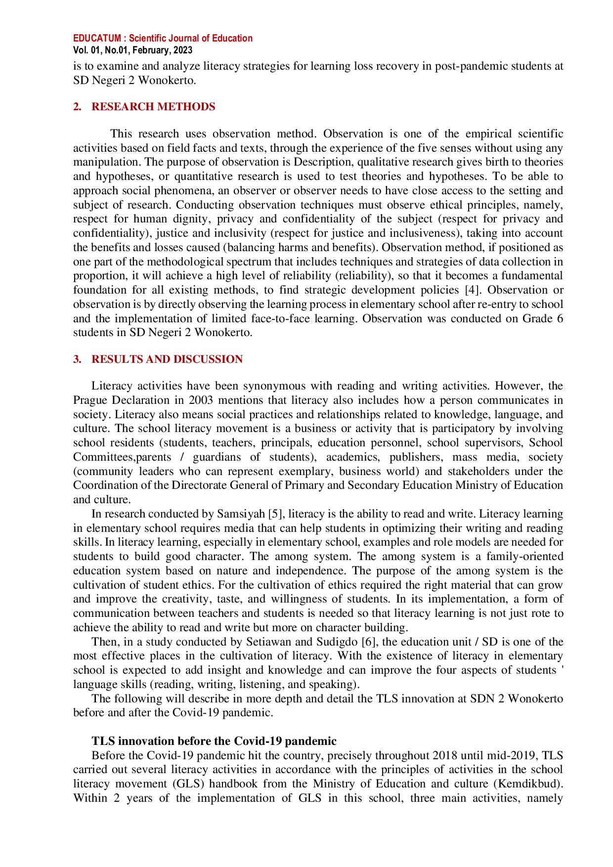 EDUCATUM: Scientific Journal of EducationEDUCATUM: Scientific Journal of EducationKehilangan belajar adalah situasi di mana siswa kehilangan pengetahuan dan keterampilan umum atau khusus atau mengalami penurunan secara akademik, yang terjadi karena adanya jeda atau ketidakberlangsungan proses pendidikan yang lama. Penelitian ini bertujuan untuk menguji dan menganalisis strategi literasi untuk pemulihan kehilangan belajar pada siswa pasca-pandemi di SD Negeri 2 Wonokerto. Metode yang digunakan adalah metode observasi, di mana observasi dilakukan dengan mengamati langsung proses belajar di sekolah dasar setelah siswa kembali ke sekolah dan pelaksanaan pembelajaran tatap muka terbatas. Observasi dilakukan pada siswa kelas 6 di SD Negeri 2 Wonokerto. Dari observasi yang dilakukan oleh Tim Literasi Sekolah (TLS) untuk menciptakan program inovasi literasi untuk pemulihan kehilangan belajar pada siswa pasca-pandemi dengan program JIBAKU (wajib membaca buku) dan SIGASA (pelindung bahasa siswa), kedua program literasi tersebut dianggap efektif dalam pemulihan kehilangan belajar pada siswa kelas 6 di SDN 2 Wonokerto.