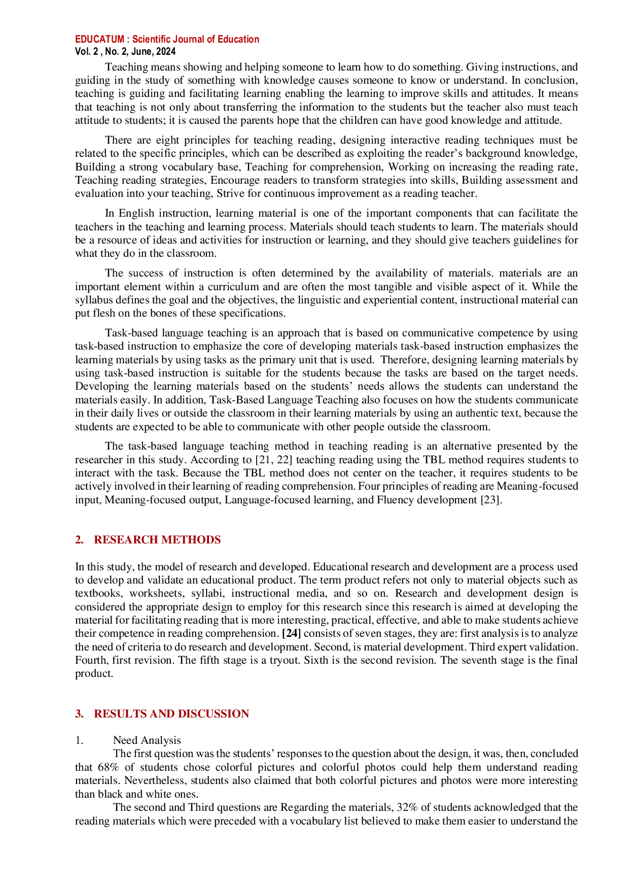 EDUCATUM: Scientific Journal of EducationEDUCATUM: Scientific Journal of EducationAgenda guru dalam menyediakan media yang menonjol untuk meningkatkan minat membaca siswa diketahui sangat berpengaruh. Oleh karena itu, penelitian saat ini bertujuan untuk mengembangkan bahan bacaan bahasa Inggris berdasarkan pendekatan pengajaran bahasa berbasis tugas untuk siswa kelas delapan SMP Muallimat Gresik. Penelitian ini dilakukan untuk mengatasi masalah yang dihadapi oleh siswa kelas delapan SMP Muallimat Gresik dalam minat membaca dan bagaimana mengembangkan bahan bacaan untuk siswa kelas delapan SMP Muallimat Gresik. Penelitian ini menggunakan metode penelitian dan pengembangan (R&D), desain penelitian dan pengembangan ini mencakup beberapa tahap. Analisis kebutuhan, mempelajari teori-teori yang terkait dengan masalah membaca, hasil analisis kebutuhan dikembangkan menjadi buku teks, dan dilakukan validasi ahli untuk menentukan kualitas produk kembali hingga penulis merasa yakin bahwa produk dapat diterbitkan dengan sempurna. Produk akhir dari penelitian ini adalah buku teks bahan bacaan yang berfokus pada peningkatan keterampilan membaca siswa; bahan bacaan ini dikembangkan berdasarkan kebutuhan dan minat siswa.