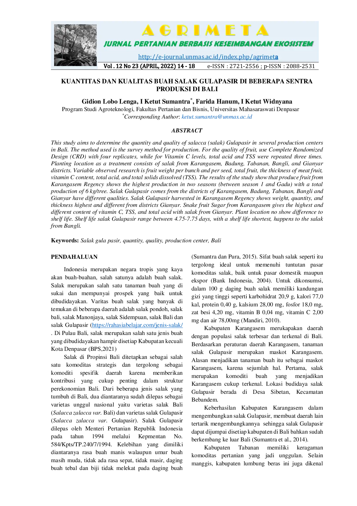 AGRIMETA : Jurnal Pertanian Berbasis Keseimbangan EkosistemAGRIMETA : Jurnal Pertanian Berbasis Keseimbangan EkosistemStudi ini bertujuan untuk menentukan kuantitas dan kualitas buah salak (salak) Gulapasir di beberapa pusat produksi di Bali. Metode yang digunakan adalah metode survei untuk produksi. Untuk kualitas buah, digunakan Rancangan Acak Lengkap (RAL) dengan empat replikasi, sedangkan untuk kadar vitamin C, asam total, dan TSS diulang tiga kali. Lokasi tanam sebagai perlakuan terdiri dari salak dari Karangasem, Badung, Tabanan, Bangli, dan Gianyar. Variabel yang diamati adalah berat buah per tangkai dan per biji, jumlah buah, ketebalan daging buah, kadar vitamin C, asam total, dan total padatan terlarut (TSS). Hasil studi menunjukkan bahwa produksi buah dari Kabupaten Karangasem menunjukkan produksi tertinggi dalam dua musim (musim sela 1 dan Gadu) dengan total produksi 6 kg/pohon. Salak Gulapasir dari Kabupaten Karangasem, Badung, Tabanan, Bangli, dan Gianyar memiliki kualitas yang berbeda. Salak Gulapasir yang dipanen di Kabupaten Karangasem menunjukkan berat, jumlah, dan ketebalan tertinggi dan berbeda dengan salak dari Kabupaten Gianyar. Kandungan vitamin C, TSS, dan asam total tertinggi ditemukan pada salak dari Karangasem. Lokasi tanam tidak menunjukkan perbedaan terhadap masa simpan. Masa simpan salak Gulapasir berkisar antara 4,75-7,75 hari, dengan masa simpan terpendek terjadi pada salak dari Bangli.