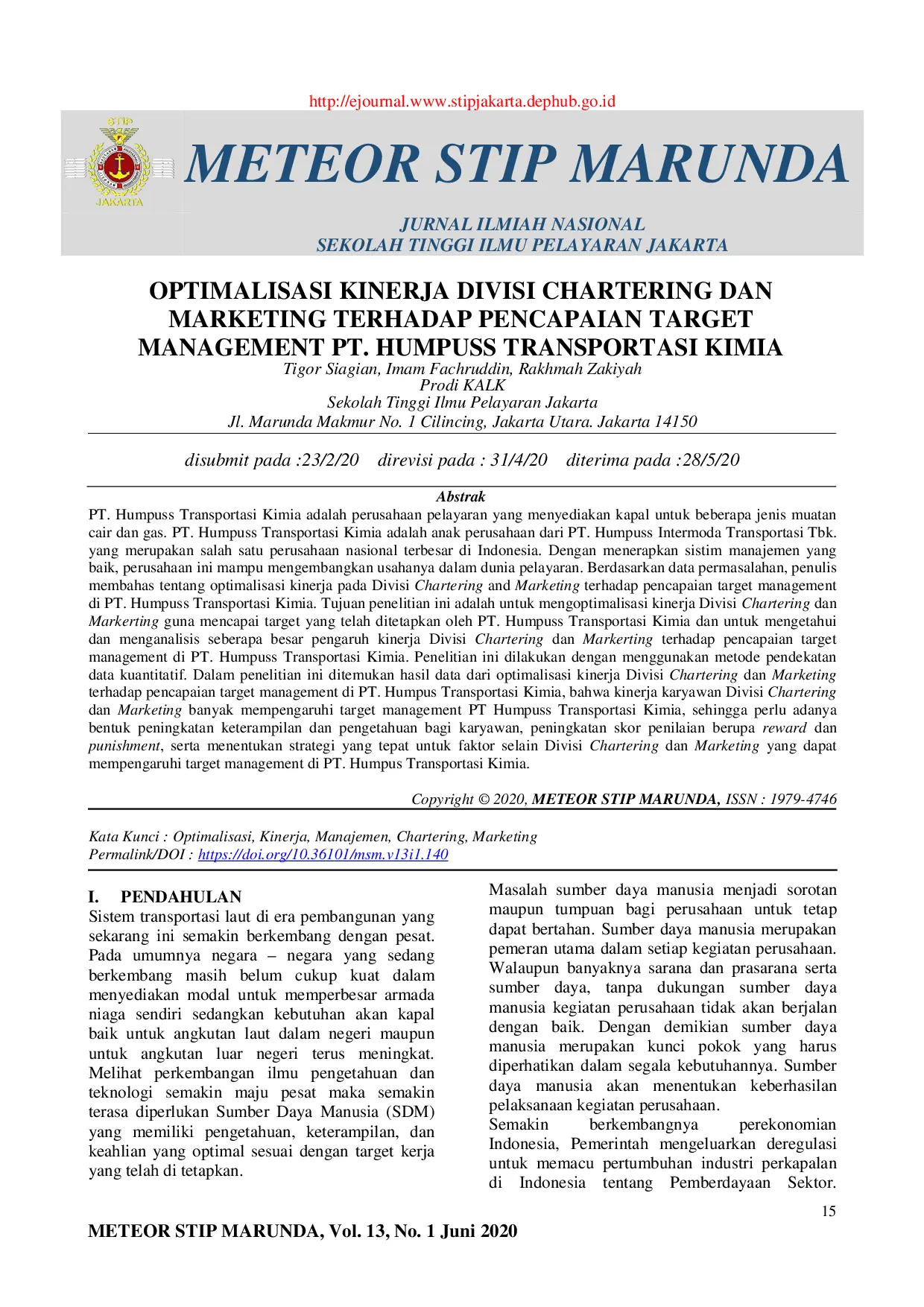 Meteor STIP MarundaMeteor STIP MarundaPT. Humpuss Transportasi Kimia adalah perusahaan pelayaran yang menyediakan kapal untuk beberapa jenis muatan cair dan gas. PT. Humpuss Transportasi Kimia adalah anak perusahaan dari PT. Humpuss Intermoda Transportasi Tbk. yang merupakan salah satu perusahaan nasional terbesar di Indonesia. Dengan menerapkan sistim manajemen yang baik, perusahaan ini mampu mengembangkan usahanya dalam dunia pelayaran. Berdasarkan data permasalahan, penulis membahas tentang optimalisasi kinerja pada Divisi Chartering and Marketing terhadap pencapaian target management di PT. Humpuss Transportasi Kimia. Tujuan penelitian ini adalah untuk mengoptimalisasi kinerja Divisi Chartering dan Markerting guna mencapai target yang telah ditetapkan oleh PT. Humpuss Transportasi Kimia dan untuk mengetahui dan menganalisis seberapa besar pengaruh kinerja Divisi Chartering dan Markerting terhadap pencapaian target management di PT. Humpuss Transportasi Kimia. Penelitian ini dilakukan dengan menggunakan metode pendekatan data kuantitatif. Dalam penelitian ini ditemukan hasil data dari optimalisasi kinerja Divisi Chartering dan Marketing terhadap pencapaian target management di PT. Humpus Transportasi Kimia, bahwa kinerja karyawan Divisi Chartering dan Marketing banyak mempengaruhi target management PT Humpuss Transportasi Kimia, sehingga perlu adanya bentuk peningkatan keterampilan dan pengetahuan bagi karyawan, peningkatan skor penilaian berupa reward dan punishment, serta menentukan strategi yang tepat untuk faktor selain Divisi Chartering dan Marketing yang dapat mempengaruhi target management di PT. Humpus Transportasi Kimia.