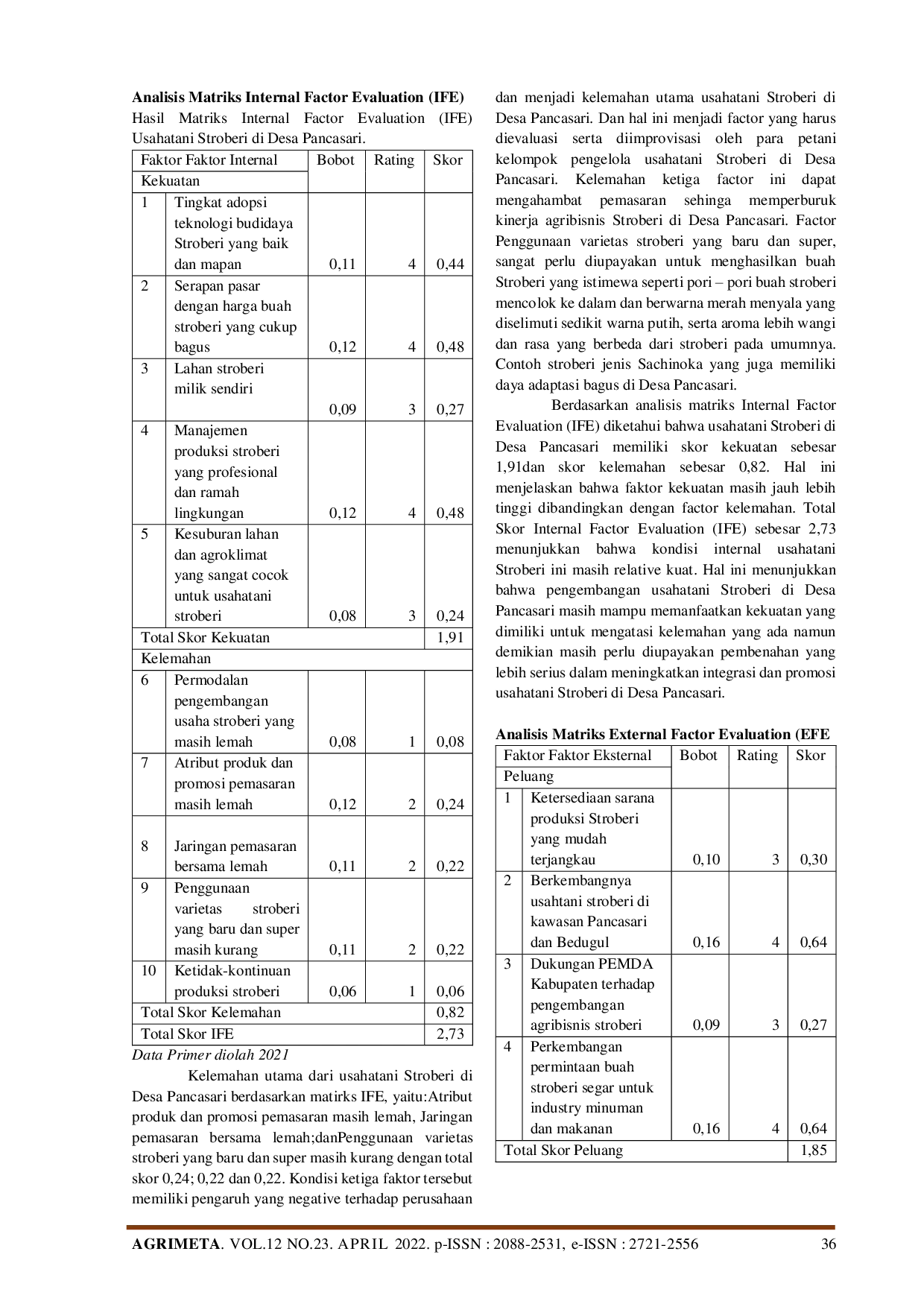 AGRIMETA : Jurnal Pertanian Berbasis Keseimbangan EkosistemAGRIMETA : Jurnal Pertanian Berbasis Keseimbangan EkosistemStroberi merupakan salah satu komoditas hortikultura yang memiliki potensi ekonomi tinggi. Desa Pancasari, Kecamatan Sukasada, Kabupaten Buleleng, merupakan salah satu daerah potensial untuk pengembangan usahatani stroberi. Penelitian ini bertujuan untuk menganalisis kondisi faktor internal dan eksternal pengembangan usahatani stroberi di Desa Pancasari dan untuk menganalisis strategi pengembangan usahatani stroberi di daerah tersebut.