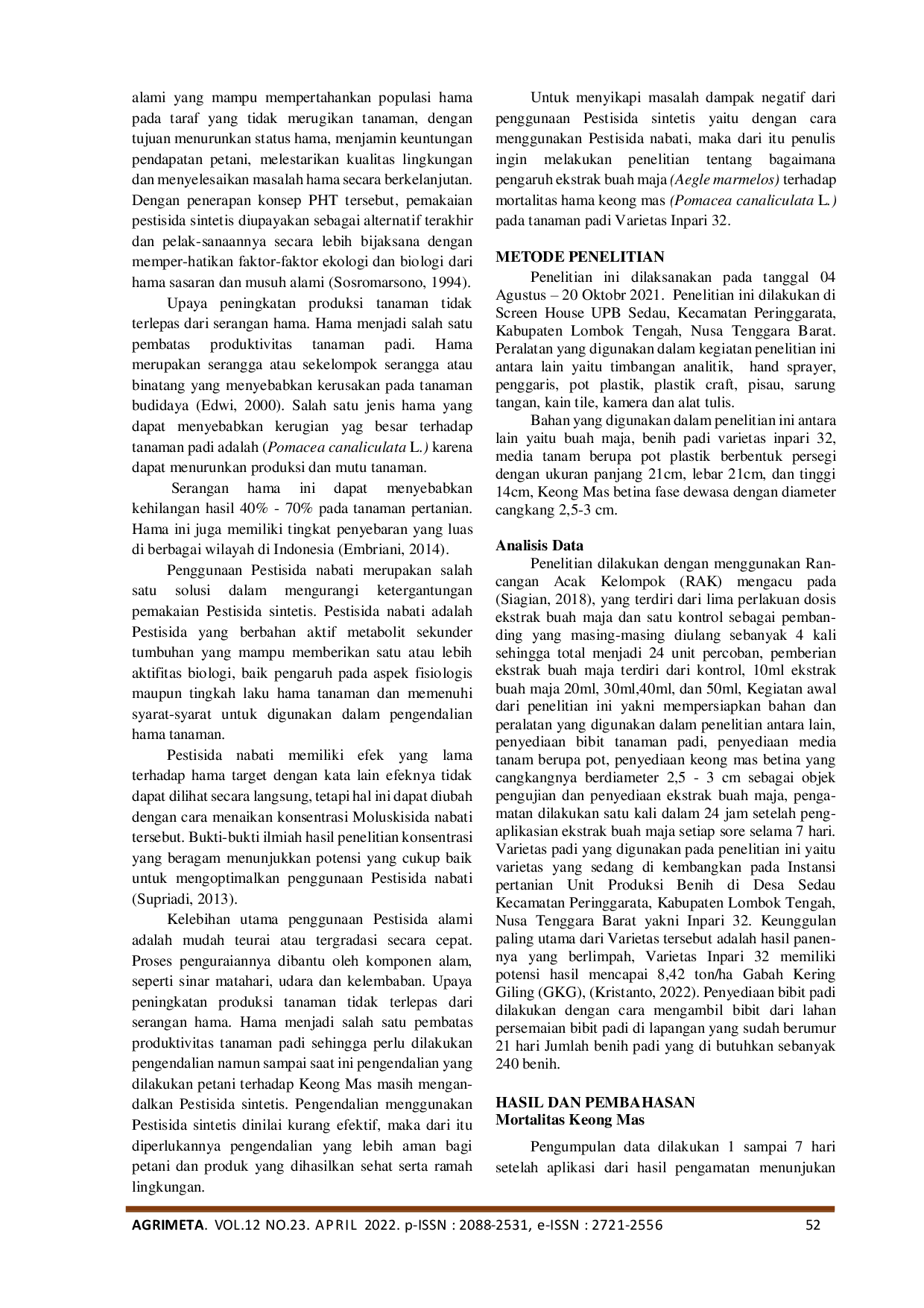 AGRIMETA : Jurnal Pertanian Berbasis Keseimbangan EkosistemAGRIMETA : Jurnal Pertanian Berbasis Keseimbangan EkosistemPengaruh ekstrak buah maja (Aegle marmelos) terhadap mortalitas hama keong mas (Pomacea canaliculata L.) pada tanaman padi. Keong mas (Pomacea canaliculata L.) merupakan salah satu hama penting pada tanaman padi yang dapat menyebabkan kerugian hasil sebesar 40‑70 % pada tanaman pertanian. Hama ini tersebar luas di berbagai wilayah Indonesia. Pengendalian keong mas dalam penelitian ini menggunakan ekstrak buah maja yang mengandung senyawa kimia alkaloid, saponin, dan tannin yang bersifat toksik terhadap hama. Penelitian dilaksanakan pada periode 4 Agustus sampai 3 September 2021 dengan tujuan menentukan pengaruh ekstrak buah maja terhadap mortalitas keong mas pada tanaman padi. Rancangan percobaan yang digunakan adalah Rancangan Acak Kelompok (RAK) dengan enam konsentrasi perlakuan, yaitu kontrol, 10 ml, 20 ml, 30 ml, 40 ml, dan 50 ml ekstrak buah maja, masing‑masing diulang empat kali. Hasil observasi menunjukkan bahwa semakin tinggi konsentrasi ekstrak yang diberikan, semakin tinggi kandungan senyawa toksik sehingga mortalitas keong mas meningkat. Mortalitas tertinggi tercapai pada konsentrasi 50 ml, sedangkan konsentrasi yang lebih rendah menghasilkan persentase kerusakan tanaman padi yang lebih tinggi. Persentase kerusakan tertinggi (100 %) terdapat pada perlakuan kontrol.