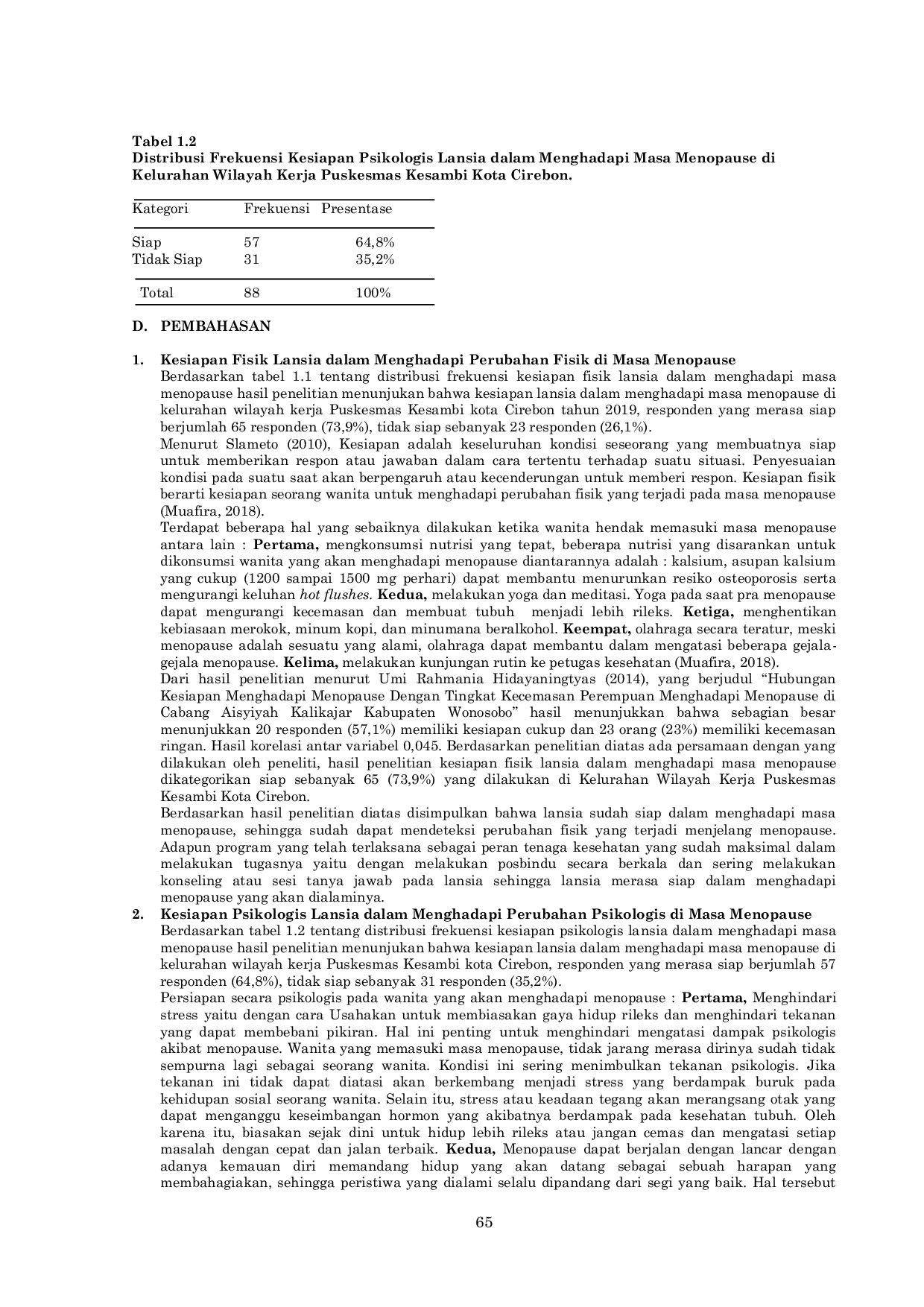 Berdasarkan hasil penelitian, kesiapan responden dalam menghadapi masa menopause dapat disimpulkan sebagai berikut.kesiapan fisik lansia dalam menghadapi perubahan fisik masa menopause dikategorikan siap 65 responden (73,9%) dan kesiapan psikologis lansia dalam menghadapi perubahan psikologis masa menopause dikategorikan siap 57 responden (64,8%).