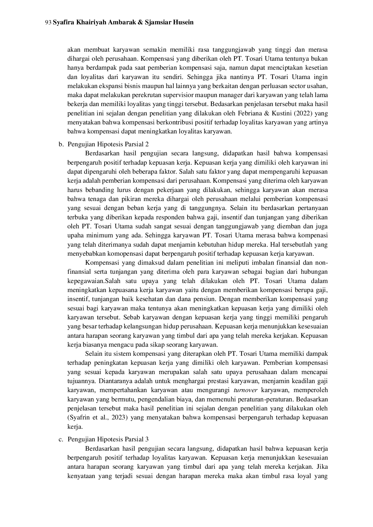 Berdasarkan pengujian yang telah dilakukan, kompensasi memiliki pengaruh positif dan signifikan terhadap loyalitas karyawan pada PT.Kompensasi juga berpengaruh positif dan signifikan terhadap kepuasan kerja karyawan pada PT.Selain itu, kepuasan kerja memiliki pengaruh positif dan signifikan terhadap loyalitas karyawan pada PT.Tosari Utama, dan kepuasan kerja dapat memediasi pengaruh kompensasi terhadap loyalitas karyawan pada PT.