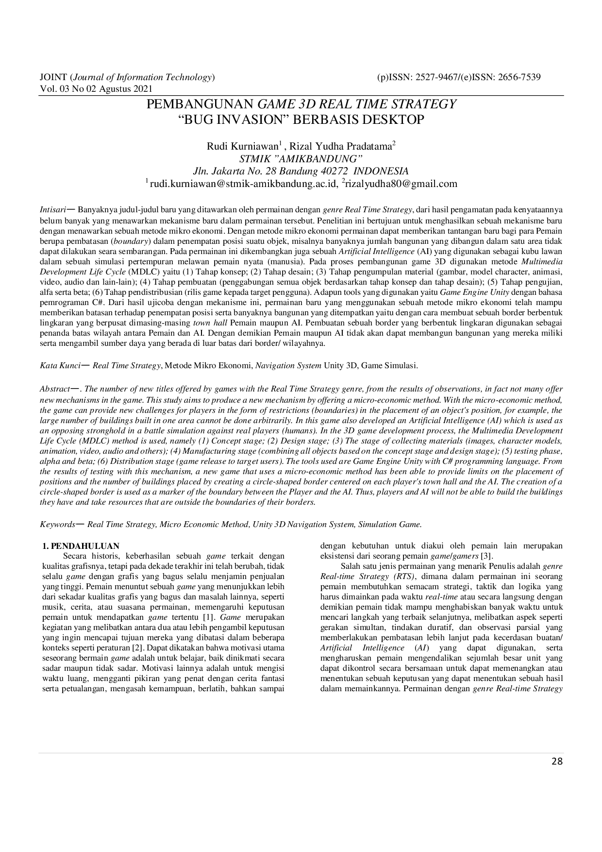 Journal of Information TechnologyJournal of Information TechnologyPenelitian ini bertujuan untuk menghasilkan sebuah mekanisme baru dengan menawarkan sebuah metode mikro ekonomi pada game 3D Real Time Strategy Bug Invasion berbasis desktop. Dengan metode mikro ekonomi, permainan dapat memberikan tantangan baru bagi para pemain berupa pembatasan dalam penempatan posisi suatu objek.
