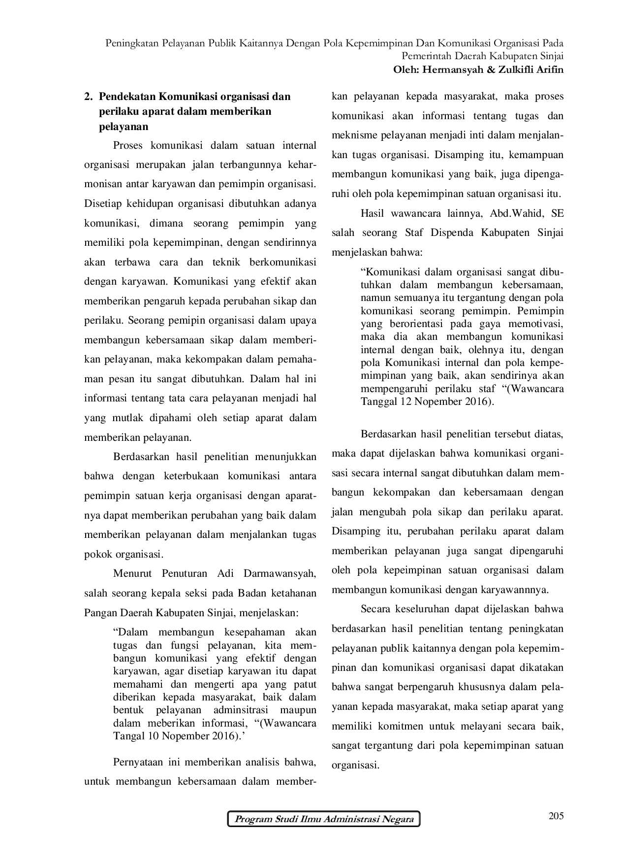 Jurnal Ilmiah Administrasita'Jurnal Ilmiah Administrasita'Penelitian ini menganalisis pengaruh pola kepemimpinan dan komunikasi organisasi terhadap perilaku aparat dalam memberikan pelayanan publik di Kabupaten Sinjai. Metode studi kasus instrumental digunakan dengan fokus pada tiga Satuan Kerja Perangkat Daerah (SKPD). Hasil menunjukkan bahwa kepemimpinan situasional dan transaksional berpengaruh signifikan terhadap disiplin serta komitmen aparat, sementara komunikasi organisasi efektif mendorong kekompakan dalam pelaksanaan tugas pelayanan publik.