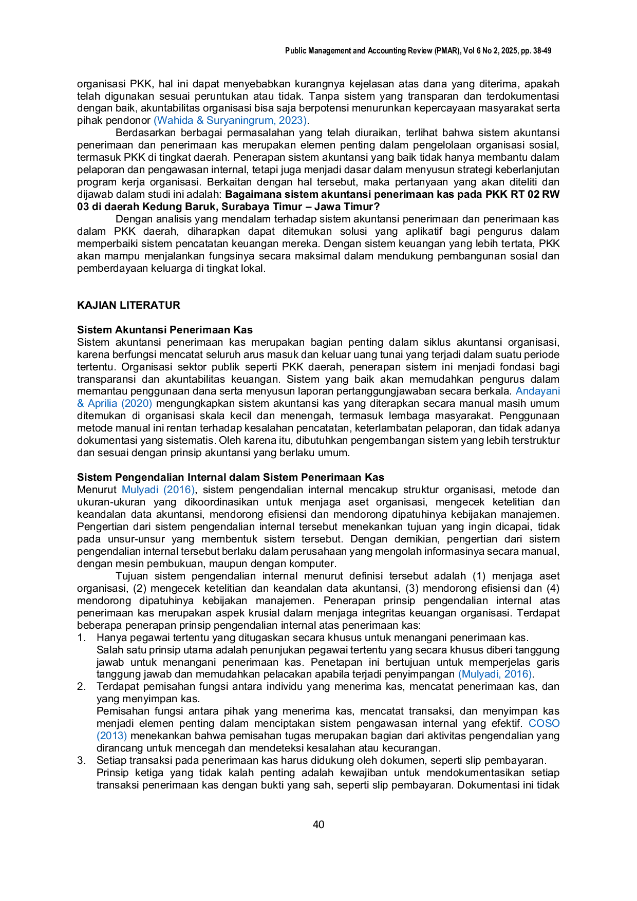 Penelitian ini menunjukkan bahwa sistem akuntansi penerimaan kas di PKK RW 03 RT 02 Kedung Baruk sudah berjalan dengan cukup baik dan terstruktur, meskipun masih mengandalkan metode manual.Pencatatan dilakukan secara rutin dan rinci, memastikan adanya transparansi dalam pengelolaan keuangan.Namun, sistem ini perlu ditingkatkan dengan memanfaatkan teknologi untuk meningkatkan efisiensi, akurasi, dan keamanan data.Dengan demikian, PKK dapat meningkatkan akuntabilitas dan kepercayaan masyarakat, serta mendukung keberlangsungan program pemberdayaan masyarakat.