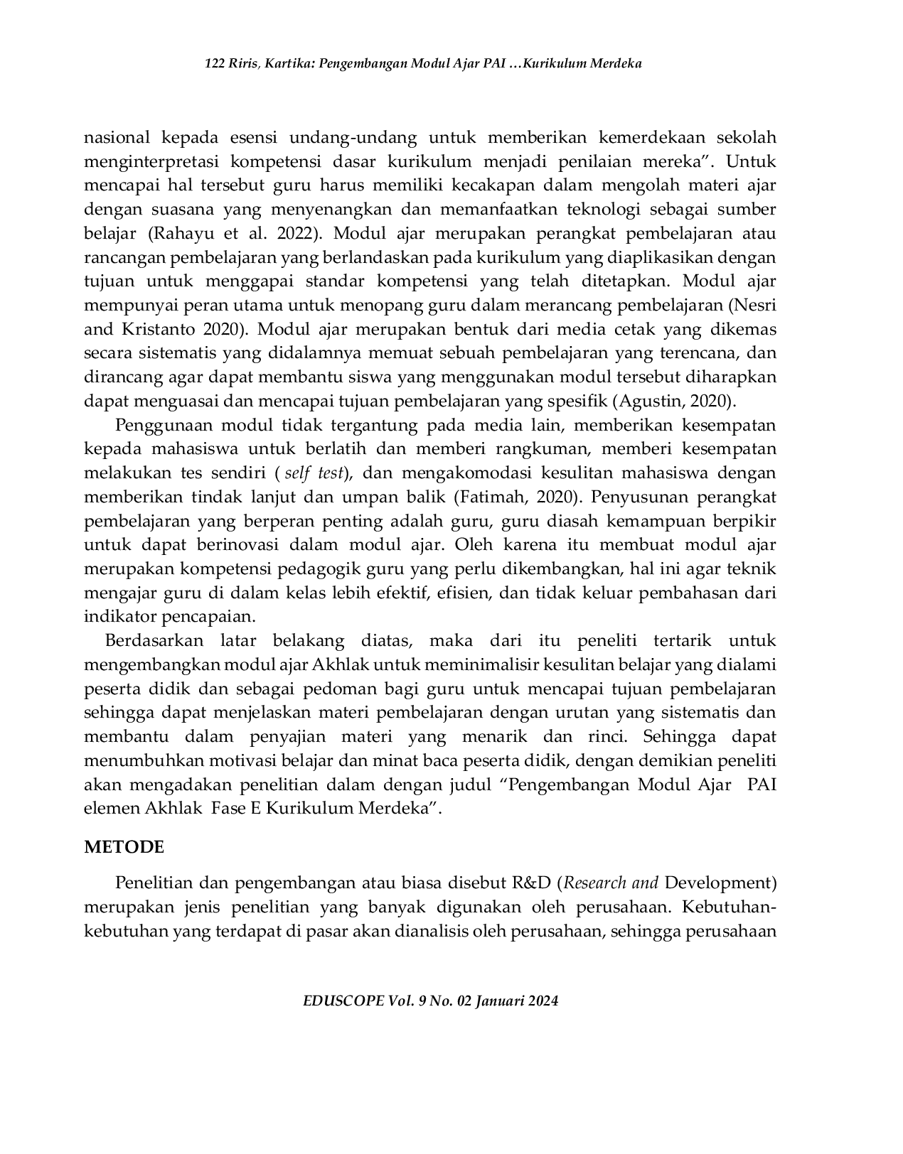 EDUSCOPE: Jurnal Pendidikan, Pembelajaran, dan TeknologiEDUSCOPE: Jurnal Pendidikan, Pembelajaran, dan TeknologiPenelitian ini bertujuan mengembangkan media pembelajaran berupa Modul Ajar PAI elemen Akhlak Fase E Kurikulum Merdeka, serta mengetahui kelayakan Modul Ajar PAI elemen Akhlak Fase E Kurikulum Merdeka.
