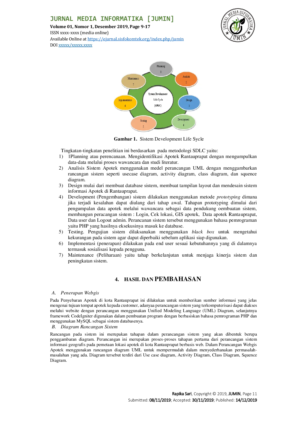Penerapan WebGIS penyebaran apotek di Kota Rantauprapat memberikan kemudahan bagi masyarakat dalam menemukan lokasi apotek yang dibutuhkan.Pendekatan perancangan menggunakan UML dan metodologi SDLC berhasil menghasilkan sistem yang terstruktur, dapat mengubah data menjadi informasi berguna, serta mendukung desain perangkat lunak yang efektif.Pengujian menggunakan metode black‑box serta prototyping membuktikan bahwa sistem berfungsi sesuai harapan dan dapat diandalkan untuk penyebaran informasi apotek.