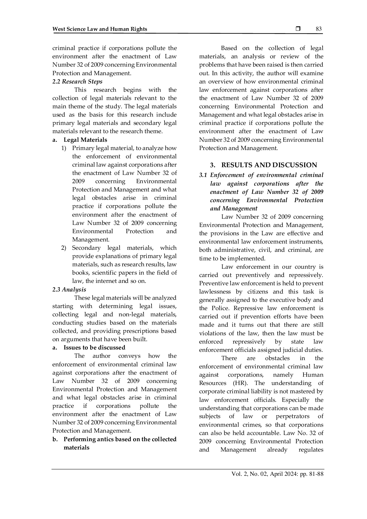 West Science Law and Human RightsWest Science Law and Human RightsTerjadinya berbagai kasus pencemaran lingkungan merupakan cerminan kurangnya tanggung jawab korporasi terhadap lingkungan, sehingga penegakan hukum lingkungan sangat dibutuhkan. Rumusan masalah dalam penelitian ini adalah: 1). Bagaimana penegakan hukum pidana lingkungan terhadap korporasi setelah berlakunya Undang-Undang Nomor 32 Tahun 2009 tentang Perlindungan dan Pengelolaan Lingkungan Hidup?; 2). Apa saja kendala hukum yang muncul dalam praktik pidana jika korporasi mencemari lingkungan setelah berlakunya Undang-Undang Nomor 32 Tahun 2009 tentang Perlindungan dan Pengelolaan Lingkungan Hidup? Penelitian ini adalah penelitian hukum normatif. Temuan dalam penelitian ini menunjukkan bahwa implementasi penegakan hukum masih lemah, yang berarti kebijakan subjektif penegak hukum untuk melanjutkan tindak pidana ke proses selanjutnya. Kondisi seperti ini dimanfaatkan sebagai peluang bagi korporasi untuk bertindak semau mereka dan mencari keuntungan maksimal. Oleh karena itu, penegakan hukum harus tegas dan konsisten. Kendala utama yang terjadi dalam praktik penegakan hukum yang dihadapi ketika korporasi melakukan kejahatan lingkungan adalah tujuh kendala yang memengaruhi penegakan hukum pidana lingkungan, meliputi: a). Keterbatasan Kapasitas Sumber Daya Manusia Penegak Hukum; b). Penegakan Hukum Lingkungan Belum Menjadi Prioritas; c). Kendala koordinasi antarlembaga dalam penanganan kejahatan lingkungan; d). Kendala Profesionalisme Penegak Hukum; e). Kendala Fasilitas atau Sarana Pendukung Penegakan Hukum; f). Ketergantungan Penerapan Penegakan Hukum Pidana Lingkungan pada Hukum Administrasi; g). Hukum Pidana masih menjadi ultimum remedium dalam penegakan hukum lingkungan.