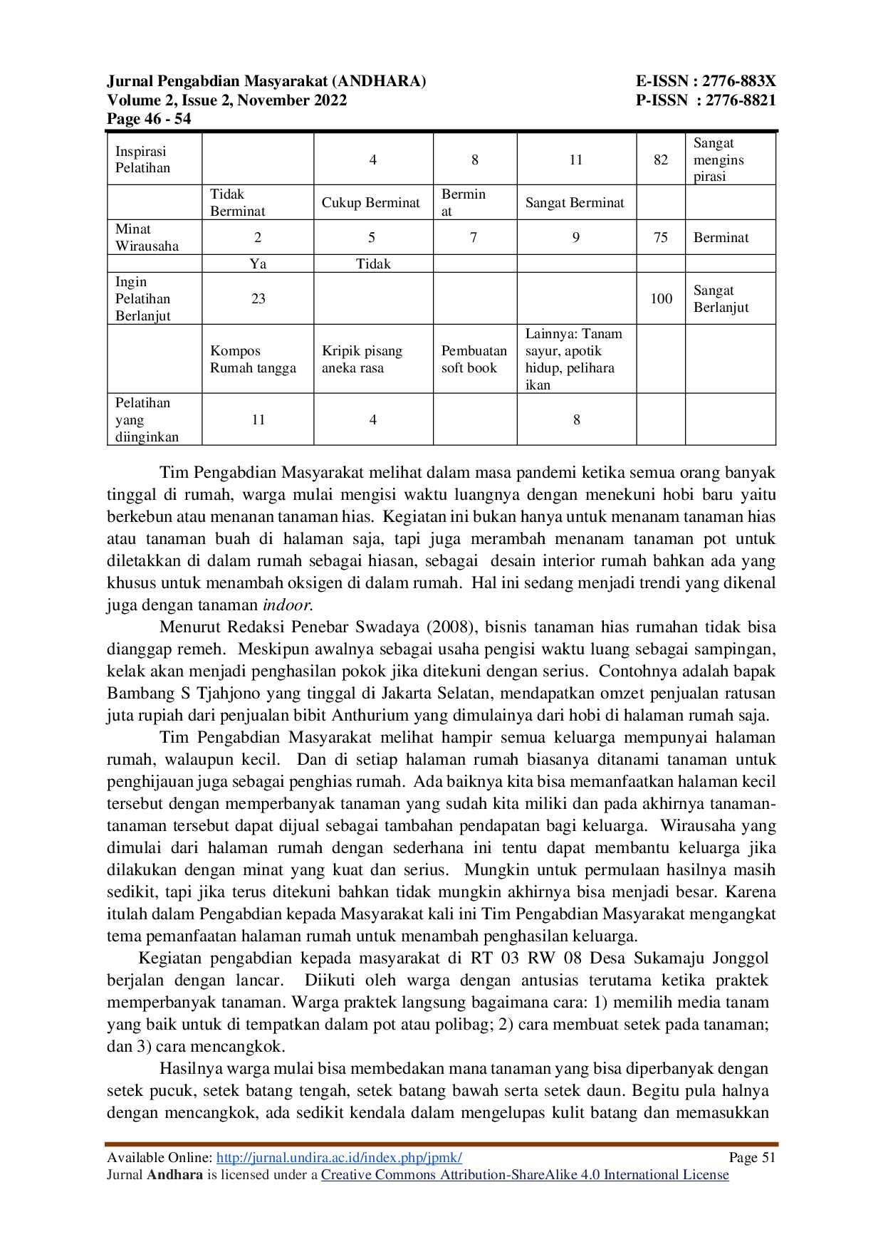 AndharaAndharaKegiatan pengabdian masyarakat ini dilakukan di Desa Sumakaju Rt 003 Rw 008, Kecamatan Jonggol, Jawa Barat pada bulan Juni 2022. Tujuannya adalah untuk memberikan penyuluhan dan pelatihan kepada warga mengenai pemanfaatan pekarangan rumah untuk menambah penghasilan keluarga dengan sasaran adalah warga RT 03 RW 08. Metode yang digunakan dengan ceramah dan praktek perbanyakan vegetatif (macam-macam setek dan cangkok). Evaluasi kegiatan PKM dilakukan dengan cara membandingkan pemahaman warga sebelum dan sesudah kegiatan melalui kuisioner yang diisi setelah pelatihan selesai. Hasilnya 82% sangat mengerti tentang perbanyakan tanaman secara vegetatif. PKM ini 82% sangat menginspirasi peserta. Dan 75% peserta berminat untuk berwirausaha . Antusias perserta 100% menginginkan PKM seperti ini berlanjut. Adapun tema-tema yang diinginkan seperti pembuatan kompos sampah rumah tangga, pembuatan kripik pisang aneka rasa, menaman sayuran dan apotek hidup di halaman, budidaya ikan di rumah.