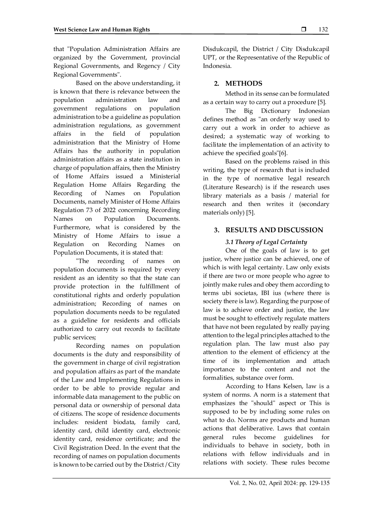 West Science Law and Human RightsWest Science Law and Human RightsUpaya pemerintah dalam mengumpulkan dan mencatat dokumen kependudukan bertujuan menyusun kebijakan yang menjamin kepastian hukum bagi warga serta mempermudah masyarakat dalam memenuhi kepentingannya. Pencatatan sipil merupakan bagian dari sistem administrasi kependudukan yang meliputi subsistem pendaftaran penduduk dan pencatatan sipil. Dokumen yang dikeluarkan oleh lembaga yang menangani berbagai urusan warga tidak dapat dipisahkan dari serangkaian proses administratif yang pada akhirnya dicatat dan disimpan dalam arsip atau basis data. Penelitian ini mengkaji bagaimana kebijakan pemerintah terkait Pengumpulan dan Pencatatan Dokumen Kependudukan dapat memberikan kepastian hukum bagi seluruh rakyat Indonesia. Berdasarkan ketentuan pendaftaran nama sebagaimana diatur dalam Peraturan Menteri Dalam Negeri No. 73 Tahun 2022 tentang Pencatatan Nama pada Dokumen Kependudukan, pendaftaran nama dilaksanakan pada akta kelahiran ketika terjadi peristiwa penting terkait kelahiran anak. Tujuan penelitian ini adalah memahami kepastian hukum dalam pengumpulan dan pencatatan dokumen penduduk untuk memberikan perlindungan hukum. Metode yang digunakan adalah penelitian normatif dengan mengkaji regulasi, buku, dan artikel ilmiah terkait. Hasil studi menunjukkan bahwa keberadaan pengumpulan dan pencatatan dokumen penduduk telah memberikan kepastian hukum bagi warga Republik Indonesia.