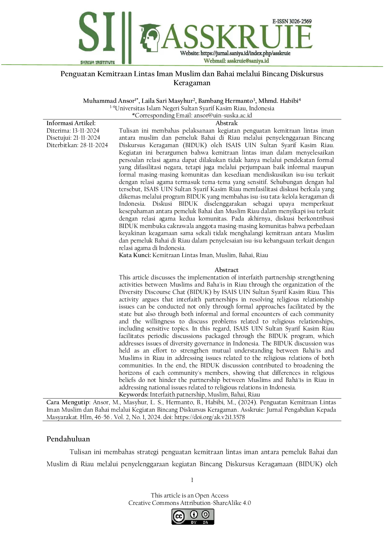 Asskruie: Jurnal Pengabdian Kepada MasyarakatAsskruie: Jurnal Pengabdian Kepada MasyarakatTulisan ini membahas pelaksanaan kegiatan penguatan kemitraan lintas iman antara muslim dan pemeluk Bahai di Riau melalui penyelenggaraan Bincang Diskursus Keragaman (BIDUK) oleh ISAIS UIN Sultan Syarif Kasim Riau. Kegiatan ini berargumen bahwa kemitraan lintas iman dalam menyelesaikan persoalan relasi agama dapat dilakukan tidak hanya melalui pendekatan formal yang difasilitasi negara, tetapi juga melalui perjumpaan baik informal maupun formal masing-masing komunitas dan kesediaan mendiskusikan isu-isu terkait dengan relasi agama termasuk tema-tema yang sensitif. Sehubungan dengan hal tersebut, ISAIS UIN Sultan Syarif Kasim Riau memfasilitasi diskusi berkala yang dikemas melalui program BIDUK yang membahas isu-isu tata-kelola keragaman di Indonesia. Diskusi BIDUK diselenggarakan sebagai upaya memperkuat kesepahaman antara pemeluk Bahai dan Muslim Riau dalam menyikapi isu terkait dengan relasi agama kedua komunitas. Pada akhirnya, diskusi berkontribusi BIDUK membuka cakrawala anggota masing-masing komunitas bahwa perbedaan keyakinan keagamaan sama sekali tidak menghalangi kemitraan antara Muslim dan pemeluk Bahai di Riau dalam penyelesaian isu-isu kebangsaan terkait dengan relasi agama di Indonesia.
