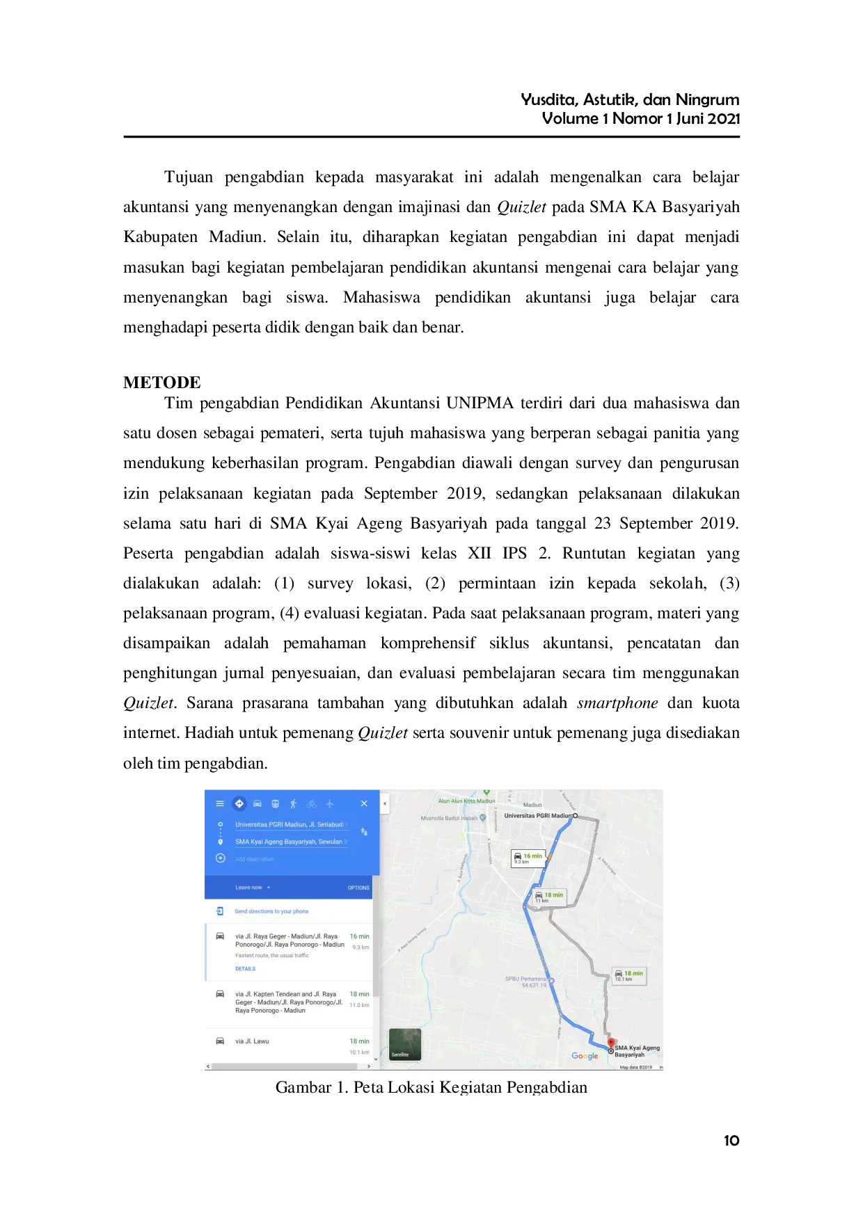 D'edukasi: Jurnal Pengabdian MasyarakatD'edukasi: Jurnal Pengabdian MasyarakatKondisi kelas yang kondusif jarang didapati di salah satu kelas di SMA KA Basyariyah. Apalagi materi yang dipelajari adalah jurnal penyesuaian yang dipandang agak sulit daripada jurnal biasa. Tujuan pengabdian kepada masyarakat ini adalah mengenalkan cara belajar akuntansi yang menyenangkan dengan imajinasi dan Quizlet pada SMA KA Basyariyah Kabupaten Madiun. Dosen dan mahasiswa Pendidikan Akuntansi Universitas PGRI Madiun berkolaborasi menciptakan suasana menyenangkan pada saat pembelajaran. Keaktifan siswa diarahkan kepada hal positif, yaitu evaluasi pembelajaran secara berkelompok menggunakan Quizlet. Pemahaman dan perilaku peserta didik berubah setelah belajar dengan cara ini. Mahasiswa pendidikan akuntansi juga mendapatkan pengalaman cara menguasai kelas sekaligus mengajar.