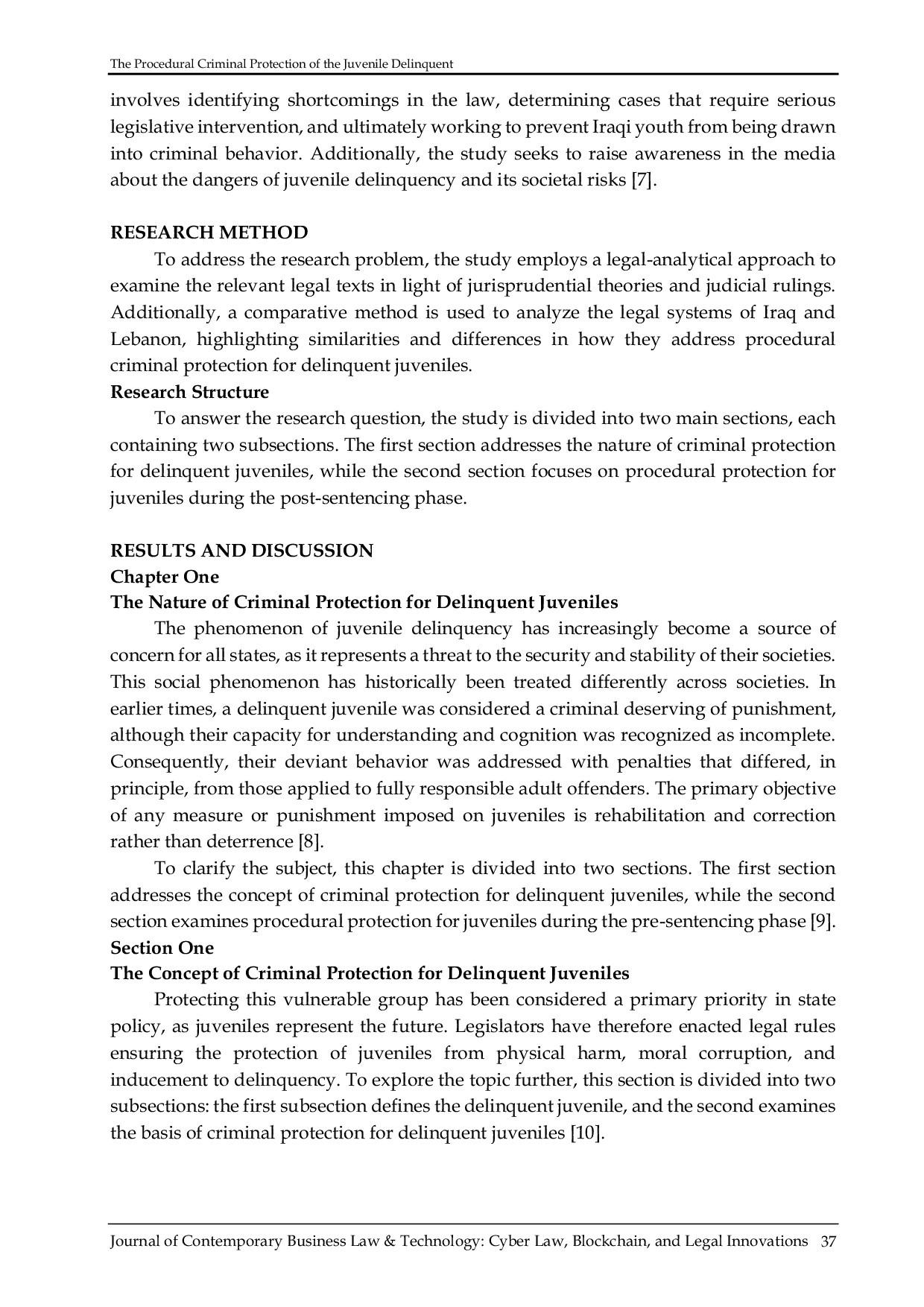 Journal of Contemporary Business Law & Technology: Cyber Law, Blockchain, and Legal InnovationsJournal of Contemporary Business Law & Technology: Cyber Law, Blockchain, and Legal InnovationsTujuan: Delikensi remaja menjadi tantangan signifikan bagi sistem hukum, dengan pendekatan yang beragam di negara seperti Irak dan Lebanon. Penelitian ini bertujuan menilai secara kritis efektivitas perlindungan prosedural terhadap pelaku remaja di kedua negara. Metode: Kedua negara telah mengesahkan undang‑undang yang memberikan perlindungan prosedural bagi remaja, namun masih terdapat ketidaksesuaian dalam penerapannya. Penelitian menemukan kekosongan hukum dan mengusulkan amandemen legislatif guna meningkatkan perlindungan remaja melalui analisis komparatif. Hasil: Undang‑undang Irak dan Lebanon telah memperkenalkan reformasi penting, termasuk hak atas perwakilan hukum dan kerahasiaan selama proses pengadilan, serta pembentukan fasilitas penahanan berfokus pada rehabilitasi. Namun, temuan menunjukkan bahwa langkah‑langkah tersebut belum sepenuhnya mencapai tujuan perlakuan khusus bagi remaja dibandingkan dewasa, dan kedua negara masih kekurangan mekanisme perawatan pasca‑penahanan serta batasan periode penahanan yang panjang. Meskipun perlindungan yang ada, kerangka legislatif di kedua negara belum cukup membedakan pelaku remaja dari orang dewasa dengan cara memenuhi kebutuhan unik mereka. Penelitian menyarankan, meskipun kedua sistem memiliki ketentuan rehabilitatif, perlunya integrasi tindakan pencegahan dan pedoman hukum yang lebih jelas.