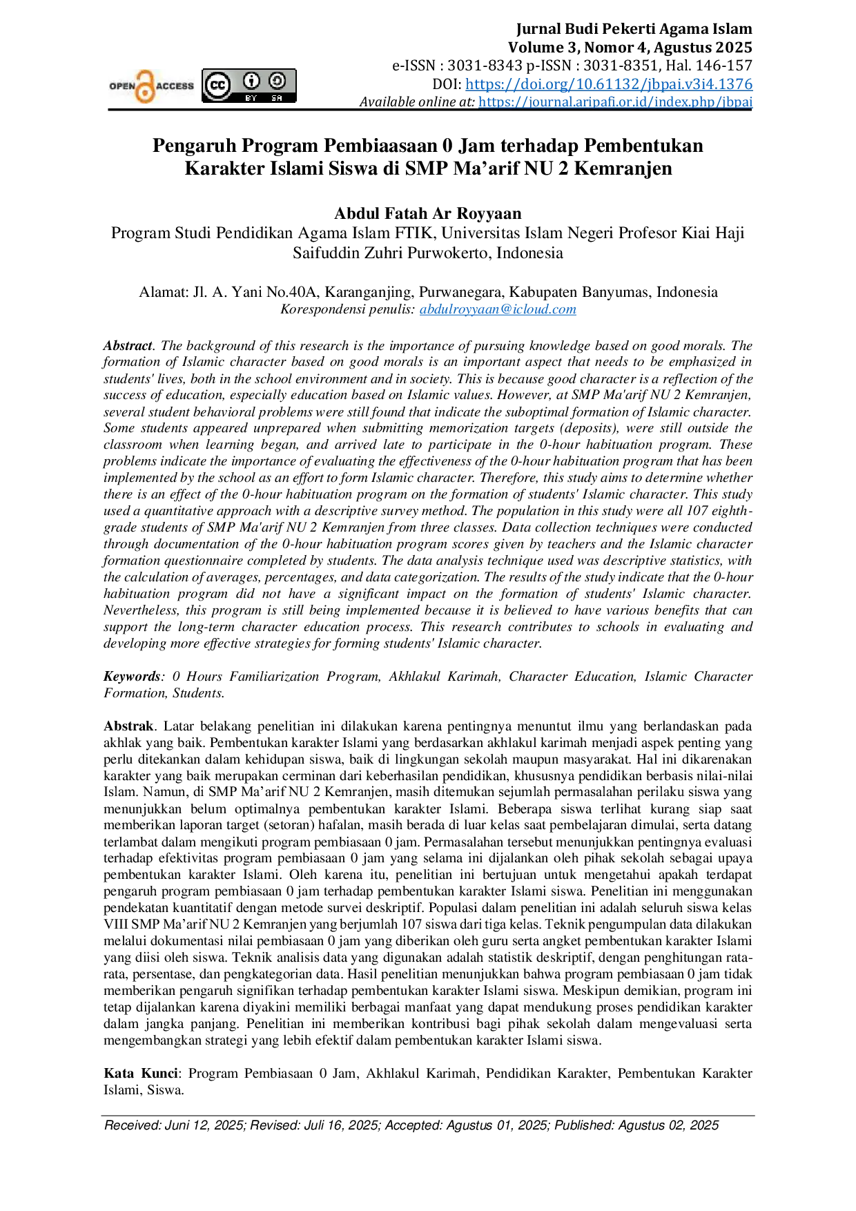 Jurnal Budi Pekerti Agama IslamJurnal Budi Pekerti Agama IslamAbstrak. Latar belakang penelitian ini dilakukan karena pentingnya menuntut ilmu yang berlandaskan pada akhlak yang baik. Pembentukan karakter Islami yang berdasarkan akhlakul karimah menjadi aspek penting yang perlu ditekankan dalam kehidupan siswa, baik di lingkungan sekolah maupun masyarakat. Hal ini dikarenakan karakter yang baik merupakan cerminan dari keberhasilan pendidikan, khususnya pendidikan berbasis nilai-nilai Islam. Namun, di SMP Maarif NU 2 Kemranjen, masih ditemukan sejumlah permasalahan perilaku siswa yang menunjukkan belum optimalnya pembentukan karakter Islami. Beberapa siswa terlihat kurang siap saat memberikan laporan target (setoran) hafalan, masih berada di luar kelas saat pembelajaran dimulai, serta datang terlambat dalam mengikuti program pembiasaan 0 jam. Permasalahan tersebut menunjukkan pentingnya evaluasi terhadap efektivitas program pembiasaan 0 jam yang selama ini dijalankan oleh pihak sekolah sebagai upaya pembentukan karakter Islami. Oleh karena itu, penelitian ini bertujuan untuk mengetahui apakah terdapat pengaruh program pembiasaan 0 jam terhadap pembentukan karakter Islami siswa. Penelitian ini menggunakan pendekatan kuantitatif dengan metode survei deskriptif. Populasi dalam penelitian ini adalah seluruh siswa kelas VIII SMP Maarif NU 2 Kemranjen yang berjumlah 107 siswa dari tiga kelas. Teknik pengumpulan data dilakukan melalui dokumentasi nilai pembiasaan 0 jam yang diberikan oleh guru serta angket pembentukan karakter Islami yang diisi oleh siswa. Teknik analisis data yang digunakan adalah statistik deskriptif, dengan penghitungan rata‑rata, persentase, dan pengkategorian data. Hasil penelitian menunjukkan bahwa program pembiasaan 0 jam tidak memberikan pengaruh signifikan terhadap pembentukan karakter Islami siswa. Meskipun demikian, program ini tetap dijalankan karena diyakini memiliki berbagai manfaat yang dapat mendukung proses pendidikan karakter dalam jangka panjang. Penelitian ini memberikan kontribusi bagi pihak sekolah dalam mengevaluasi serta mengembangkan strategi yang lebih efektif dalam pembentukan karakter Islami siswa.