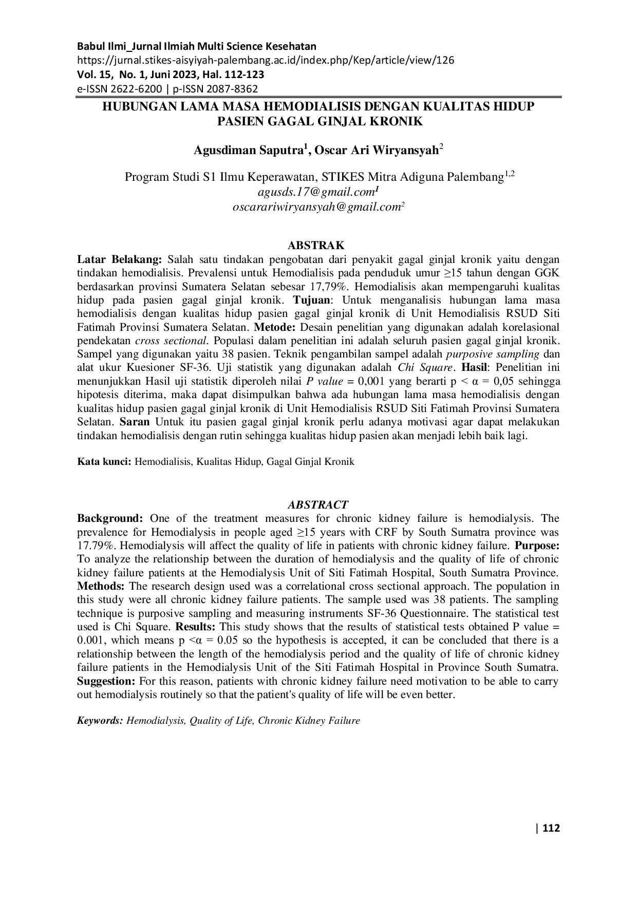 Babul Ilmi Jurnal Ilmiah Multi Science KesehatanBabul Ilmi Jurnal Ilmiah Multi Science KesehatanLatar Belakang: Salah satu tindakan pengobatan dari penyakit gagal ginjal kronik yaitu dengan tindakan hemodialisis. Prevalensi untuk Hemodialisis pada penduduk umur ≥15 tahun dengan GGK berdasarkan provinsi Sumatera Selatan sebesar 17,79%. Hemodialisis akan mempengaruhi kualitas hidup pada pasien gagal ginjal kronik. Tujuan: Untuk menganalisis di Unit Hemodialisis RSUD Siti Fatimah Provinsi Sumatera Selatan. Metode: Desain penelitian yang digunakan adalah korelasional pendekatan cross sectional. Populasi dalam penelitian ini adalah seluruh pasien gagal ginjal kronik. Sampel yang digunakan yaitu 38 pasien. Teknik pengambilan sampel adalah purposive sampling dan alat ukur Kuesioner SF-36. Uji statistik yang digunakan adalah Chi Square. Hasil: Penelitian ini menunjukkan Hasil uji statistik diperoleh nilai P value = 0,001 yang berarti p < α = 0,05 sehingga hipotesis diterima, maka dapat disimpulkan bahwa ada di Unit Hemodialisis RSUD Siti Fatimah Provinsi Sumatera Selatan. Saran Untuk itu pasien gagal ginjal kronik perlu adanya motivasi agar dapat melakukan tindakan hemodialisis dengan rutin sehingga kualitas hidup pasien akan menjadi lebih baik lagi.