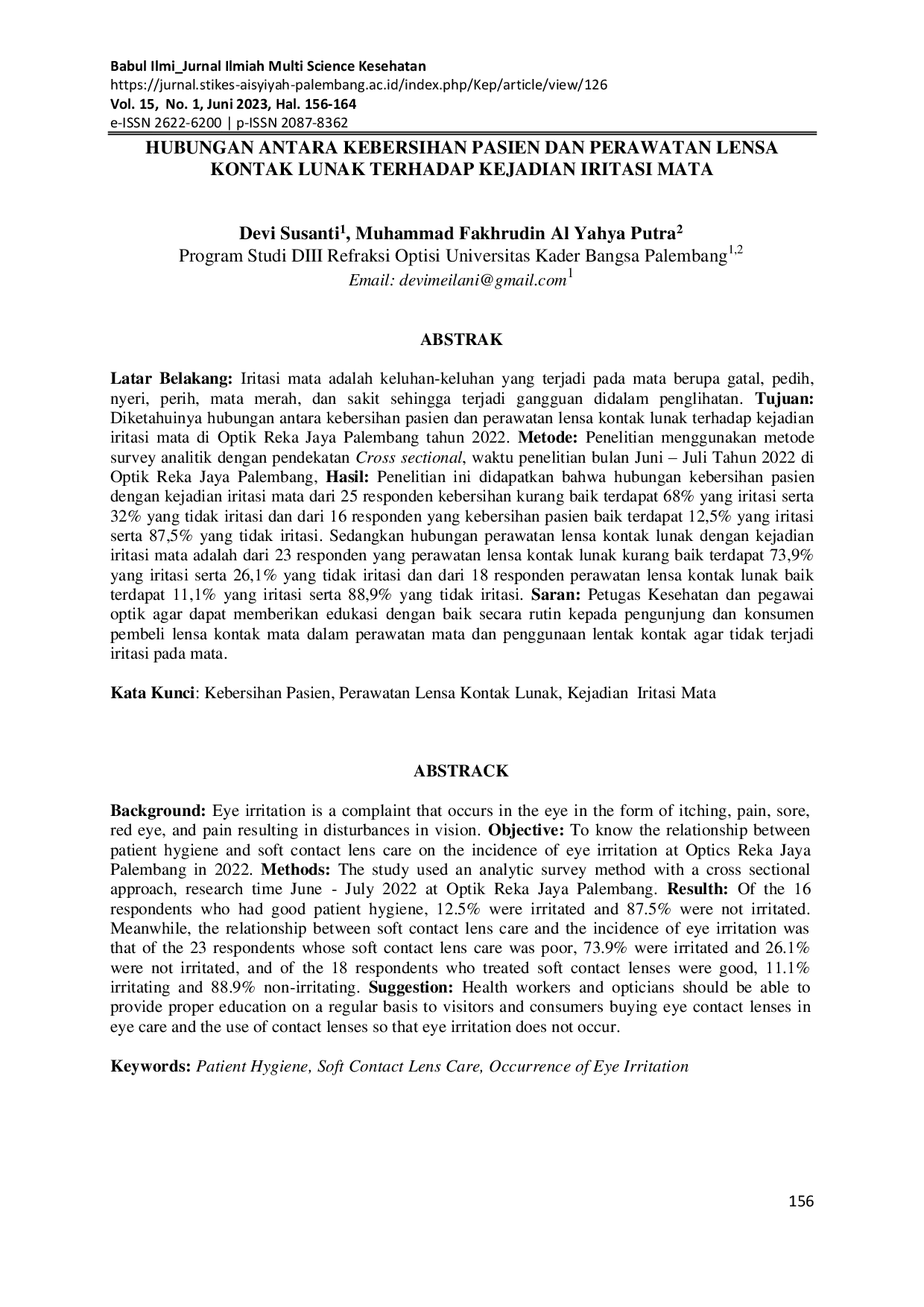 Babul Ilmi Jurnal Ilmiah Multi Science KesehatanBabul Ilmi Jurnal Ilmiah Multi Science KesehatanLatar Belakang: Iritasi mata adalah keluhan-keluhan yang terjadi pada mata berupa gatal, pedih, nyeri, perih, mata merah, dan sakit sehingga terjadi gangguan dalam penglihatan. Tujuan: Diketahuinya di Optik Reka Jaya Palembang tahun 2022. Metode: Penelitian menggunakan metode survey analitik dengan pendekatan cross‑sectional, waktu penelitian bulan Juni–Juli 2022 di Optik Reka Jaya Palembang. Hasil: Penelitian ini didapatkan bahwa hubungan kebersihan pasien dengan kejadian iritasi mata dari 25 responden kebersihan kurang baik terdapat 68% yang iritasi serta 32% yang tidak iritasi dan dari 16 responden yang kebersihan pasien baik terdapat 12,5% yang iritasi serta 87,5% yang tidak iritasi. Sedangkan hubungan perawatan lensa kontak lunak dengan kejadian iritasi mata adalah dari 23 responden yang perawatan lensa kontak lunak kurang baik terdapat 73,9% yang iritasi serta 26,1% yang tidak iritasi dan dari 18 responden perawatan lensa kontak lunak baik terdapat 11,1% yang iritasi serta 88,9% yang tidak iritasi. Saran: Petugas kesehatan dan pegawai optik agar dapat memberikan edukasi dengan baik secara rutin kepada pengunjung dan konsumen pembeli lensa kontak mata dalam perawatan mata dan penggunaan lensa kontak agar tidak terjadi iritasi pada mata.