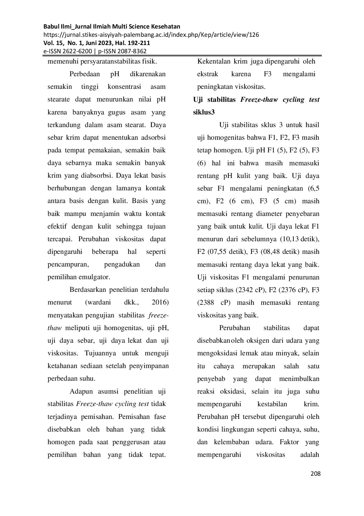 Babul Ilmi Jurnal Ilmiah Multi Science KesehatanBabul Ilmi Jurnal Ilmiah Multi Science KesehatanLatar Belakang: Mikania micrantha atau dikenal dengan sebutan sembung rambat merupakan salah satu spesies dari famili Asteraceae, dimana tumbuhan ini telah digunakan sebagai obat tradisional. Maka dalam hal ini menjadi dasar potensi daun sembung rambat untuk dapat dimanfaatkan menjadi formulasi sediaan krim. Bentuk sediaan krim dipilih karena mempunyai keuntungan yaitu, nyaman dipakai, mudah meresap pada kulit, tidak lengket, dan mudah dicuci dengan air. Sediaan krim tersebut dimanfaatkan sebagai penyakit kulit. Tujuan: Penelitian ini telah diketahuinya sembung rambat dapat diformulasikan dalam sediaan krim dan mengetahui pada dosis berapakah sediaan krim yang terbaik dalam uji stabilitas fisik sediaan krim. Metode: Metode yang digunakan dalam penelitian ini yaitu metode maserasi dan tahap uji stabilitas fisik krim menggunakan metode Freeze-thaw cycling test. Penelitian ini dilaksanakan selama 1 bulan lebih dari bulan Juli sampai dengan Agustus 2022, bertempat di Laboratorium Teknologi Formulasi Program Studi S-1 Farmasi STIKES Aisyiyah Palembang. Hasil: Penelitian menunjukkan sediaan krim dari ekstrak etanol daun sembung rambat bahwa ketiga krim dengan konsentrasi 10%, 15% dan 20% menghasilkan sediaan krim yang baik serta memenuhi persyaratan uji sifat fisik krim dan uji stabilitas krim. Saran : Untuk peneliti selanjutnya agar dapat dilakukan evaluasi lain dalam pengujian sediaan krim dari ekstrak etanol daun sembung ramba , misalnya pengujian terhadap hewan uji mencit atau tikus.