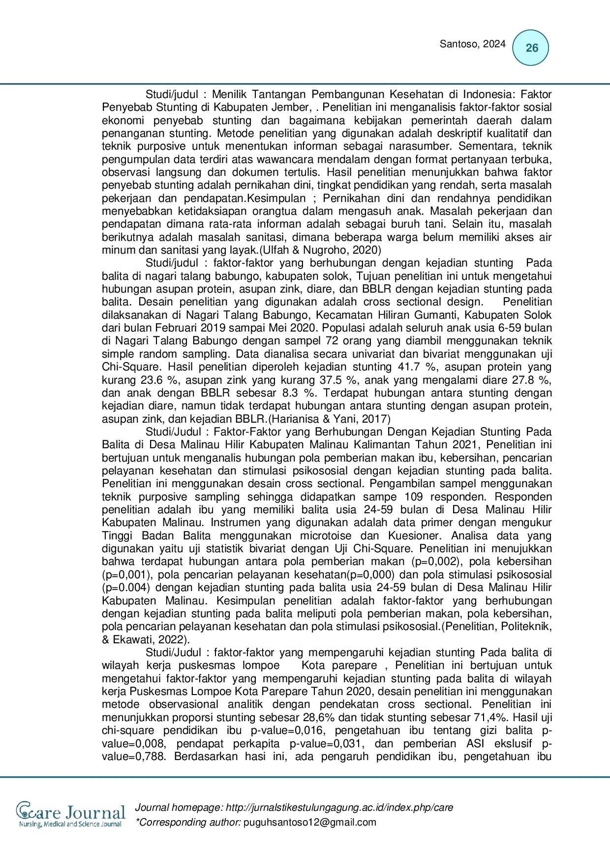 Care JournalCare JournalStunting pada anak merupakan masalah nasional yang disebabkan oleh multifaktor yang berdampak negatif terhadap sumber daya manusia di masa depan, antara lain berdampak terhadap penurunan kecerdasan, kerentanan terhadap penyakit, menghambat pertumbuhan ekonomi dan produktivitas kerja, serta memperburuk kesenjangan. Stunting pada anak balita merupakan konsekuensi dari beberapa faktor yang sering dikaitkan dengan kemiskinan, termasuk gizi, kesehatan, sanitasi, dan lingkungan. Ada lima faktor utama penyebab stunting, yaitu kemiskinan, sosial dan budaya, peningkatan paparan terhadap penyakit infeksi, kerawanan pangan, dan akses masyarakat terhadap pelayanan kesehatan. Tujuan dari literatur review ini adalah untuk menganalisa faktor-faktor yang berpengaruh terhadap stunting. Metode: Literatur yang didapatkan dari SINTA, PUBMED, Garuda, dan Google Scholar databased. 10 literatur review menggunakan beberapa desain, yaitu deskriptif eksploratif, cross sectional, deskriptif cross sectional study, case-control, deskriptif analitik, deskriptif dari tahun 2013–2023, kemudian dilakukan analisa PICO. Hasil: hasil penelitian menunjukkan faktor-faktor yang bervariasi. Kesimpulan: Faktor-faktor stunting bisa dipengaruhi oleh kemiskinan, sosial dan budaya, peningkatan paparan terhadap penyakit infeksi, kerawanan pangan, dan akses masyarakat terhadap pelayanan kesehatan secara sendiri atau bersama-sama.