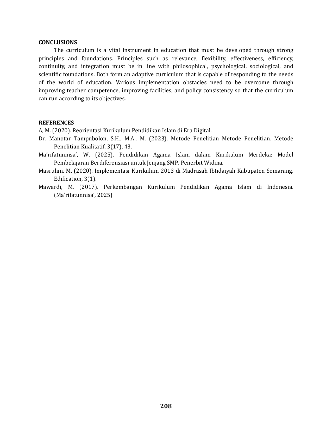 Kurikulum adalah instrumen vital dalam pendidikan yang harus dikembangkan melalui prinsip dan landasan yang kuat.Prinsip relevansi, fleksibilitas, efektivitas, efisiensi, kontinuitas, dan integrasi harus selaras dengan landasan filosofis, psikologis, sosiologis, dan keilmuan.Kedua hal tersebut membentuk kurikulum adaptif yang mampu merespons kebutuhan dunia pendidikan.Berbagai hambatan implementasi perlu diatasi melalui peningkatan kompetensi guru, perbaikan fasilitas, dan konsistensi kebijakan agar kurikulum berjalan sesuai tujuan.