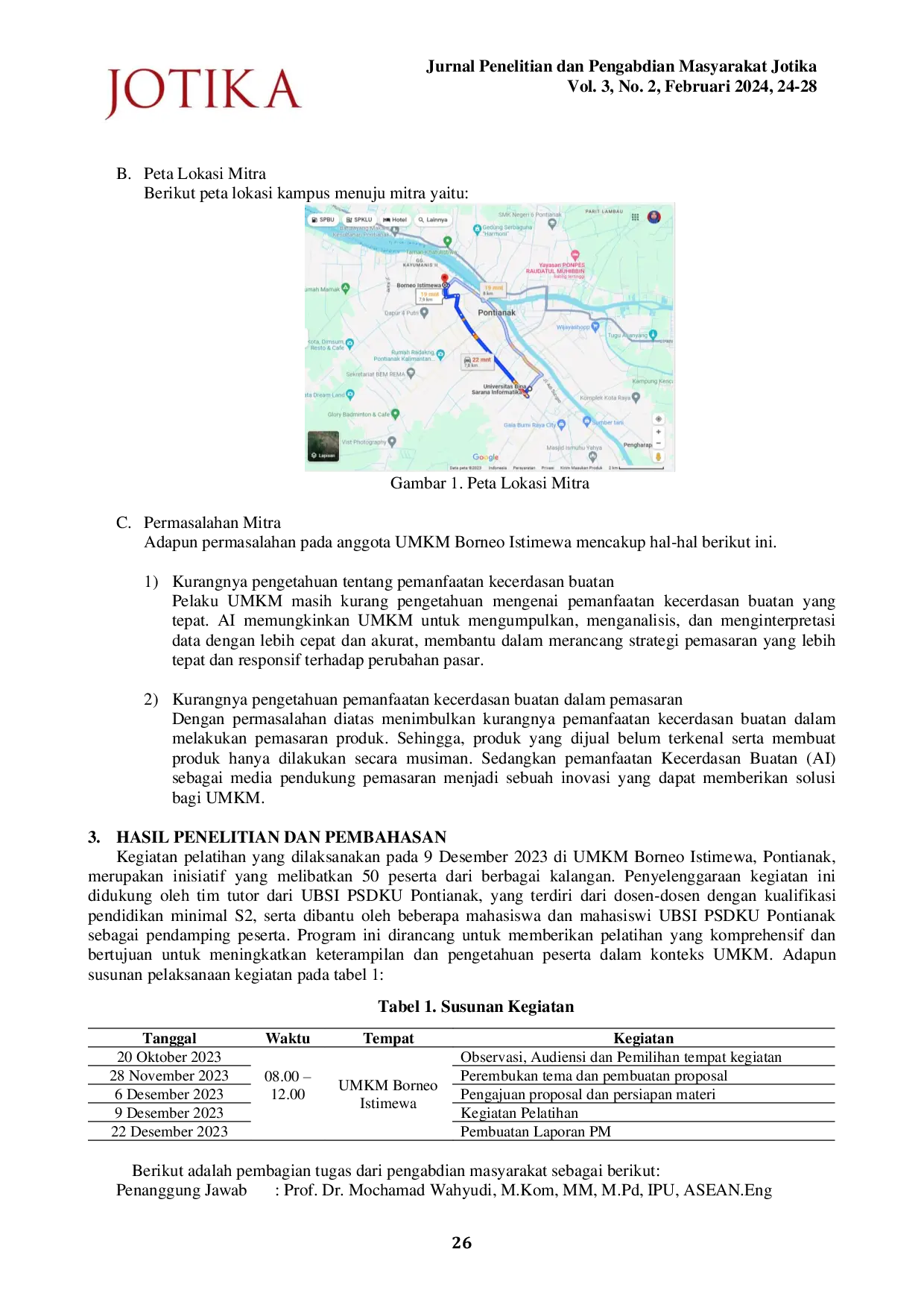 Jurnal Penelitian dan Pengabdian Masyarakat JotikaJurnal Penelitian dan Pengabdian Masyarakat JotikaKemajuan teknologi informasi telah menjadi kekuatan besar dalam mengubah cara perusahaan melakukan bisnis. Ketika informasi menjadi lebih mudah diakses dan menyebar, teknologi informasi memainkan peran sentral dalam membentuk strategi, operasi, dan interaksi perusahaan dengan pelanggan dan mitra bisnis. Kecerdasan Buatan yang dalam bahasa Inggris disebut Artificial Intelligence (AI) adalah salah satu konsep teknologi informasi dari cabang ilmu komputer dalam meniru kecerdasan manusia. Tujuan dari AI adalah memproses sebuah informasi, belajar dari pengalaman, adaptasi dari perubahan, dan melakukan tugas-tugas tertentu secara mandiri. Setelah dianalisa, masih banyak anggota UMKM Borneo Istimewa yang masih kurang pemahaman akan pemnfaatan kecerdasan buatan dalam hal pemasaran produk. Sehingga membuat produk yang dijual kurang terkenal, jika menggunakan kecerdasan buatan akan lebih mudah dalam melakukan pemasaran produk. Dengan adanya pelatihan mengenai pemanfaatan kecerdasan buatan ini, diharapkan akan menambah pengetahuan pelaku UMKM serta memberi dampak positif untuk penjualan produk mereka.
