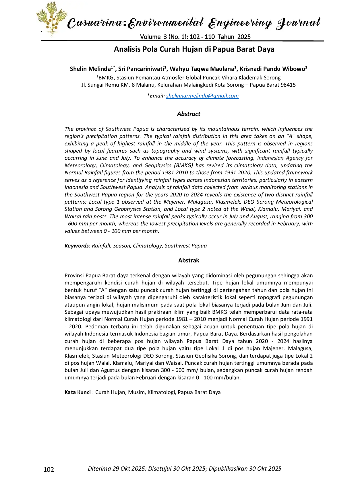 Casuarina: Environmental Engineering JournalCasuarina: Environmental Engineering JournalProvinsi Papua Barat daya terkenal dengan wilayah yang didominasi oleh pegunungan sehingga akan mempengaruhi kondisi curah hujan di wilayah tersebut. Tipe hujan lokal umumnya mempunyai bentuk huruf “A dengan satu puncak curah hujan tertinggi di pertengahan tahun dan pola hujan ini biasanya terjadi di wilayah yang dipengaruhi oleh karakteristik lokal seperti topografi pegunungan ataupun angin lokal, hujan maksimum pada saat pola lokal biasanya terjadi pada bulan Juni dan Juli.
