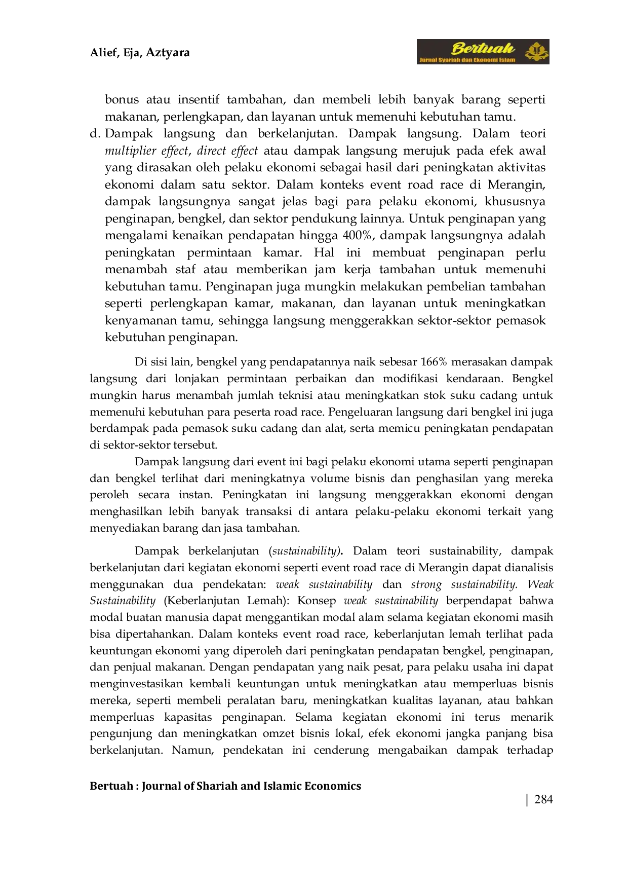 Bertuah Jurnal Syariah dan Ekonomi IslamBertuah Jurnal Syariah dan Ekonomi IslamPenelitian ini bertujuan untuk menganalisis dampak multiplier (berganda) yang ditimbulkan oleh event Road Race terhadap perekonomian pedagang di Kabupaten Merangin. Penelitian ini menggunakan metode deskriptif kualitatif dengan pendekatan lapangan untuk menggali data langsung dari pedagang yang terlibat secara ekonomi selama pelaksanaan event tersebut. Data dikumpulkan melalui wawancara mendalam, observasi, dan studi dokumentasi. Hasil penelitian menunjukkan bahwa event Road Race memberikan dampak ekonomi yang signifikan bagi pedagang lokal. Dampak tersebut meliputi peningkatan pendapatan langsung selama pelaksanaan event (direct effect), efek tidak langsung melalui aktivitas ekonomi pendukung seperti transportasi dan penginapan (indirect effect), serta efek berkelanjutan yang mendorong perputaran ekonomi di masyarakat (induced effect). Selain itu, event ini juga membantu memperluas jaringan pasar pedagang dan meningkatkan daya beli masyarakat setempat.
