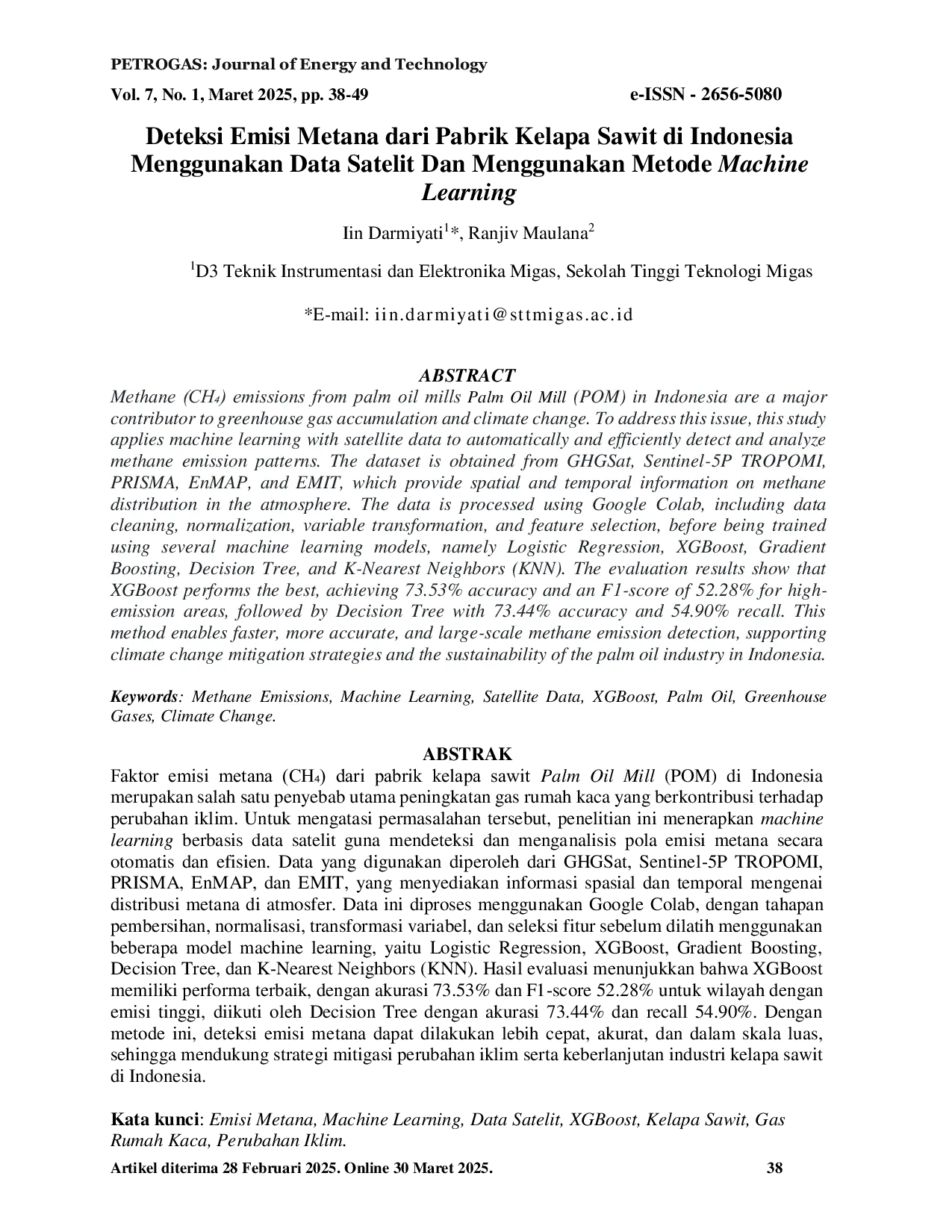 PETROGAS: Journal of Energy and TechnologyPETROGAS: Journal of Energy and TechnologyFaktor emisi metana (CHβ) dari pabrik kelapa sawit Palm Oil Mill (POM) di Indonesia merupakan salah satu penyebab utama peningkatan gas rumah kaca yang berkontribusi terhadap perubahan iklim. Untuk mengatasi permasalahan tersebut, penelitian ini menerapkan machine learning berbasis data satelit guna mendeteksi dan menganalisis pola emisi metana secara otomatis dan efisien. Data yang digunakan diperoleh dari GHGSat, Sentinel-5P TROPOMI, PRISMA, EnMAP, dan EMIT, yang menyediakan informasi spasial dan temporal mengenai distribusi metana di atmosfer. Data ini diproses menggunakan Google Colab, dengan tahapan pembersihan, normalisasi, transformasi variabel, dan seleksi fitur sebelum dilatih menggunakan beberapa model machine learning, yaitu Logistic Regression, XGBoost, Gradient Boosting, Decision Tree, dan K-Nearest Neighbors (KNN). Hasil evaluasi menunjukkan bahwa XGBoost memiliki performa terbaik, dengan akurasi 73.53% dan F1-score 52.28% untuk wilayah dengan emisi tinggi, diikuti oleh Decision Tree dengan akurasi 73.44% dan recall 54.90%. Dengan metode ini, deteksi emisi metana dapat dilakukan lebih cepat, akurat, dan dalam skala luas, sehingga mendukung strategi mitigasi perubahan iklim serta keberlanjutan industri kelapa sawit di Indonesia.