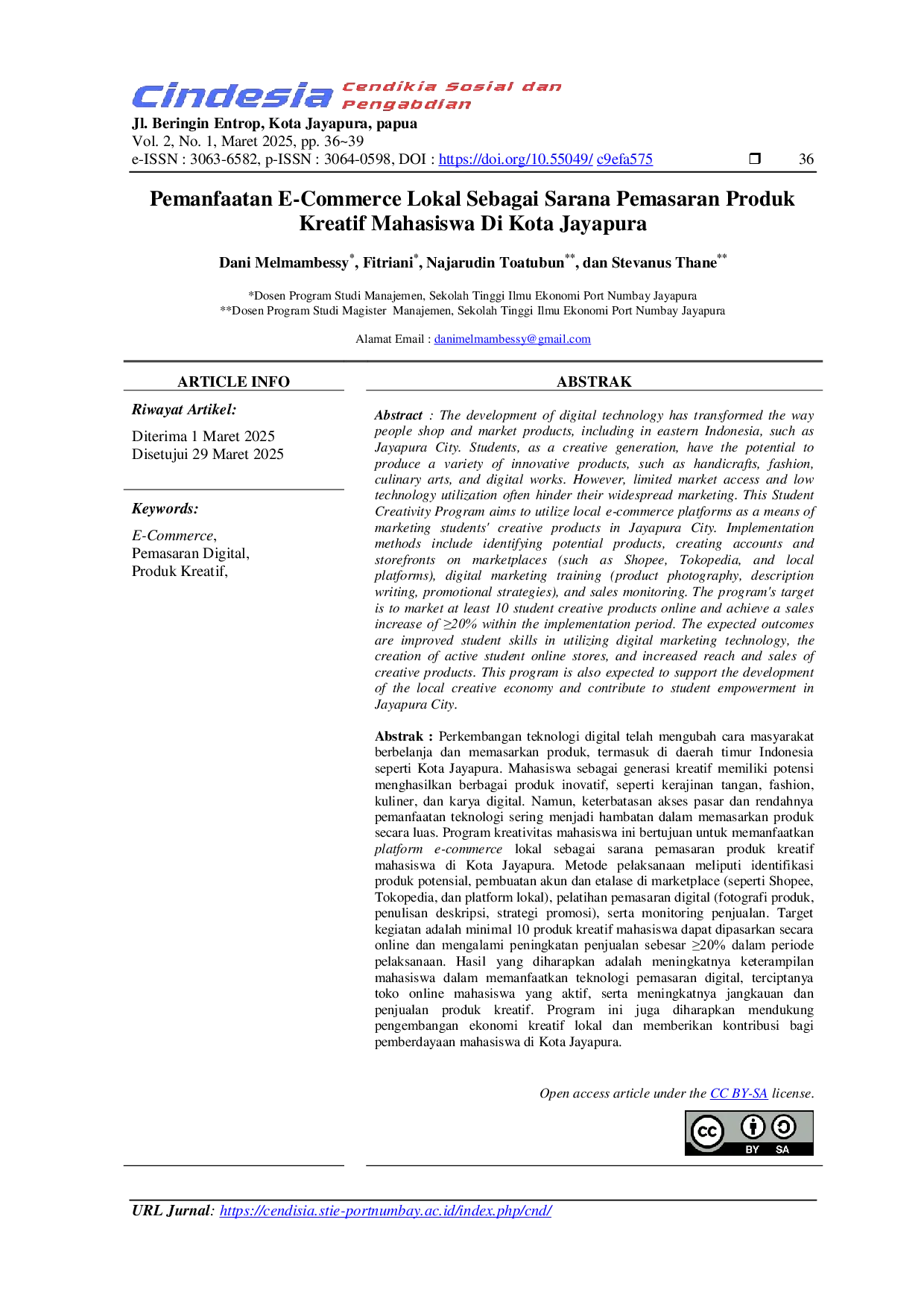 Cendisia : Cendekia Sosial dan PengabdianCendisia : Cendekia Sosial dan PengabdianPerkembangan teknologi digital telah mengubah cara masyarakat berbelanja dan memasarkan produk, termasuk di daerah timur Indonesia seperti Kota Jayapura. Mahasiswa sebagai generasi kreatif memiliki potensi menghasilkan berbagai produk inovatif, seperti kerajinan tangan, fashion, kuliner, dan karya digital. Namun, keterbatasan akses pasar dan rendahnya pemanfaatan teknologi sering menjadi hambatan dalam memasarkan produk secara luas. Program kreativitas mahasiswa ini bertujuan untuk memanfaatkan platform e-commerce lokal sebagai sarana pemasaran produk kreatif mahasiswa di Kota Jayapura. Metode pelaksanaan meliputi identifikasi produk potensial, pembuatan akun dan etalase di marketplace (seperti Shopee, Tokopedia, dan platform lokal), pelatihan pemasaran digital (fotografi produk, penulisan deskripsi, strategi promosi), serta monitoring penjualan. Target kegiatan adalah minimal 10 produk kreatif mahasiswa dapat dipasarkan secara online dan mengalami peningkatan penjualan sebesar ≥20% dalam periode pelaksanaan. Hasil yang diharapkan adalah meningkatnya keterampilan mahasiswa dalam memanfaatkan teknologi pemasaran digital, terciptanya toko online mahasiswa yang aktif, serta meningkatnya jangkauan dan penjualan produk kreatif. Program juga diharapkan mendukung pengembangan ekonomi kreatif lokal dan memberikan kontribusi bagi pemberdayaan mahasiswa di Kota Jayapura.