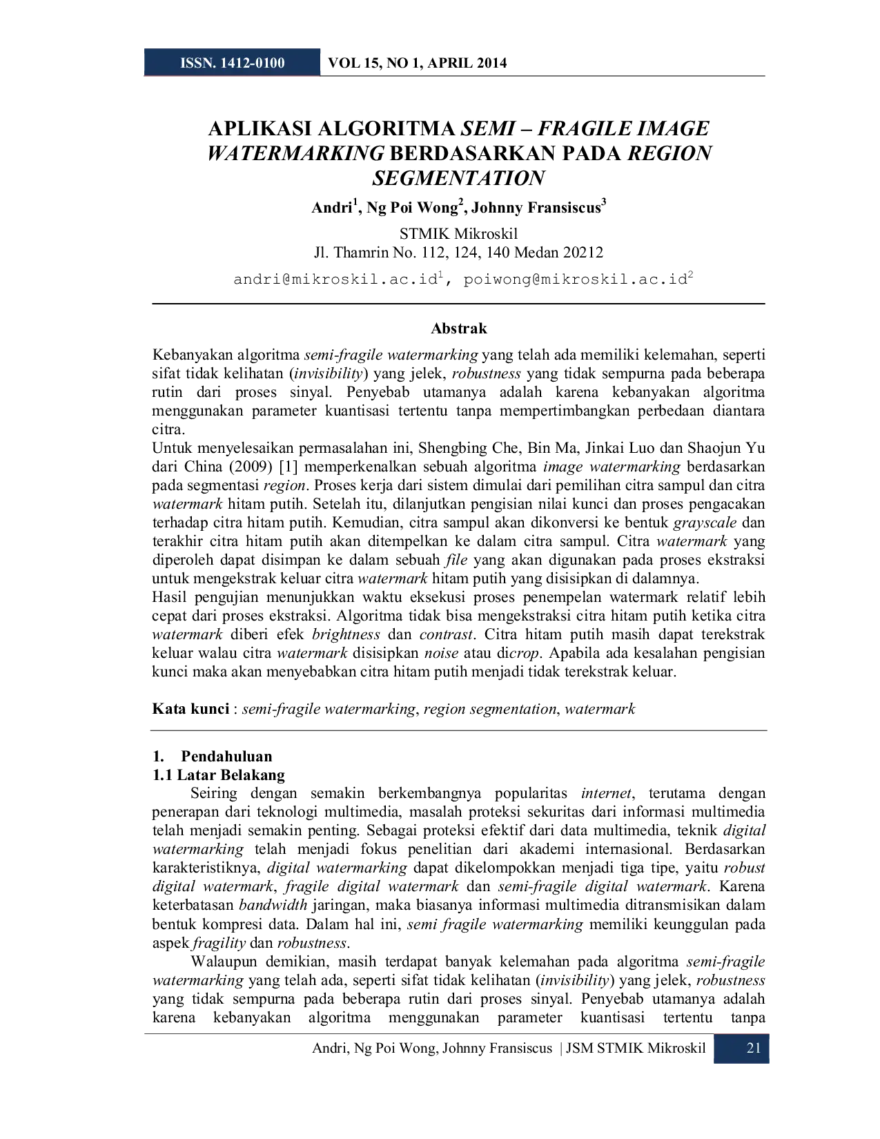 Jurnal Sifo MikroskilJurnal Sifo MikroskilKebanyakan algoritma semi-fragile watermarking yang telah ada memiliki kelemahan, seperti sifat tidak kelihatan (invisibility) yang jelek, dan robustness yang tidak sempurna pada beberapa proses sinyal. Penyebab utamanya adalah karena kebanyakan algoritma menggunakan parameter kuantisasi tertentu tanpa mempertimbangkan perbedaan di antara citra. Untuk mengatasi permasalahan ini, Shengbing Che, Bin Ma, Jinkai Luo dan Shaojun Yu dari China (2009) memperkenalkan sebuah algoritma image watermarking berdasarkan pada segmentasi region. Proses kerja sistem dimulai dengan pemilihan citra sampul dan citra watermark hitam putih, diikuti dengan pengisian nilai kunci dan proses pengacakan terhadap citra hitam putih. Citra sampul kemudian dikonversi ke grayscale, dan citra hitam putih ditempelkan ke dalamnya. Citra watermark yang diperoleh disimpan untuk proses ekstraksi citra watermark hitam putih. Hasil pengujian menunjukkan waktu eksekusi penempelan watermark relatif lebih cepat dari ekstraksi. Algoritma tidak dapat mengekstrak citra hitam putih ketika diberi efek brightness dan contrast, tetapi masih dapat diekstrak meskipun diberi noise atau dicrop. Kesalahan pengisian kunci menyebabkan citra hitam putih tidak terekstrak.