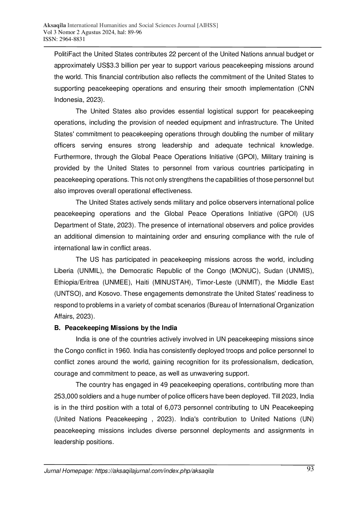 Aksaqila International Humanities and Social Sciences [AIHSS] JournalAksaqila International Humanities and Social Sciences [AIHSS] JournalDiplomasi pertahanan, yang lebih dikenal sebagai diplomasi militer, merupakan penggunaan kekuatan militer secara non-kekerasan untuk memajukan hubungan diplomatik suatu negara dan mempromosikan agenda internasionalnya. Penelitian ini bertujuan untuk mengkaji praktik penggunaan diplomasi pertahanan oleh Amerika Serikat dan India dalam misi perdamaian, khususnya yang berada di bawah mandat Perserikatan Bangsa-Bangsa (PBB). Melalui pendekatan kualitatif, penelitian ini menganalisis studi kasus melalui tinjauan literatur. Temuan penelitian menyoroti pentingnya diplomasi pertahanan dalam mencapai kepentingan nasional melalui misi perdamaian serta mengidentifikasi faktor-faktor kunci yang memengaruhi efektivitasnya, seperti kapasitas dan kemampuan militer, kerja sama antarlembaga, serta perumusan strategi diplomatik. Hasil penelitian memberikan wawasan penting mengenai peran diplomasi pertahanan dalam konteks hubungan internasional dan potensinya dalam meningkatkan efektivitas diplomasi.