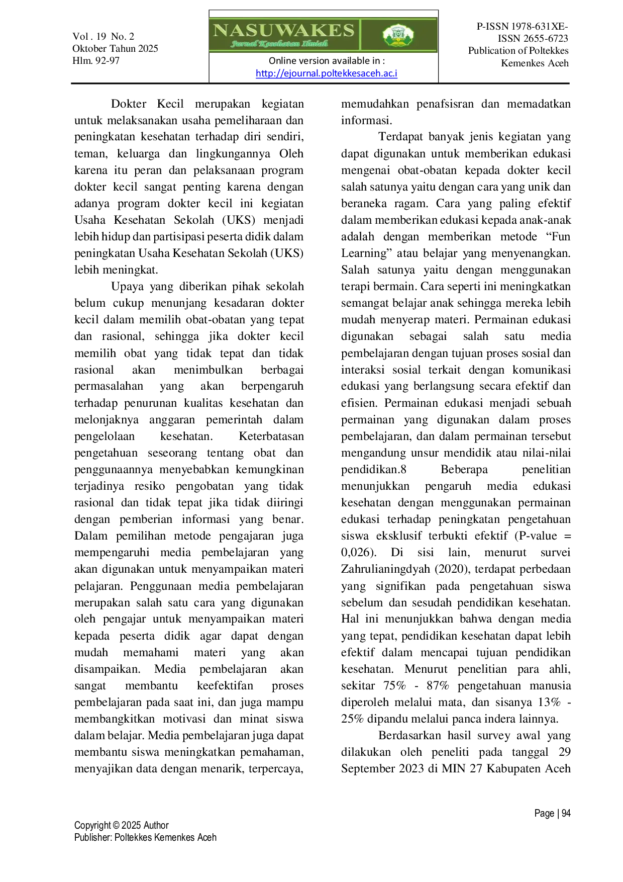 NASUWAKES: Jurnal Kesehatan IlmiahNASUWAKES: Jurnal Kesehatan IlmiahDokter kecil merupakan peserta didik yang dipilih karena memenuhi kriteria dan dilatih untuk ikut melaksanakan usaha dalam peningkatan kesehatan terhadap diri sendiri, teman, keluarga dan lingkungannya, termasuk dalam pemberian obat-obatan yang baik dan benar. Namun, pada usia dokter kecil pengetahuan mengenai obat-obatan masih sangat kurang sehingga diperlukan adanya pembekalan lebih lanjut. Terdapat banyak jenis kegiatan yang dapat digunakan sebagai media pembelajaran salah satunya yaitu menggunakan media permainan edukasi. Penelitian ini dilakukan untuk mengetahui pengaruh media edukasi kesehatan menggunakan Alat Permainan Edukasi (APE) tentang obat-obatan yang terdapat pada kotak P3K. penelitian ini bersifat deskriptif analitik dengan menggunakan metode pre-eksperimen, perencanaan yang digunakan adalah one grup, pretest dan posttest design yaitu melakukan satu kali pengukuran didepan (pretest) sebelum adanya perlakuan (treatment) dan setelah itu dilakukan pengukuran lagi (post test). Populasi dalam penelitian ini adalah seluruh siswa/i MIN 27 Kabupaten Aceh Besar yang terdaftar sebagai anggota dokter kecil yang berjumlah 41 orang. Teknik pengambilan sampel yang digunakan yaitu total sampling. Hasil penelitian menunjukkan bahwa rata-rata pengetahuan siswa/i sebelum diberikan penyuluhan yaitu 6.83 dan pengetahuan siswa/i sesudah dilakukan penyuluhan menjadi 14.68, adanya peningkatan pengetahuan siswa/i sebelum dan sesudah diberikan edukasi dengan selisih 7,82. Dari hasil penelitian yang didapat dapat disimpulkan bahwa adanya pengaruh pemberian edukasi kesehatan menggunakan Alat Permainan Edukasi (APE) terhadap pengetahuan dokter kecil mengenai obat-obatan yang terdapat pada kotak P3K di MIN 27 Kabupaten Aceh Besar.