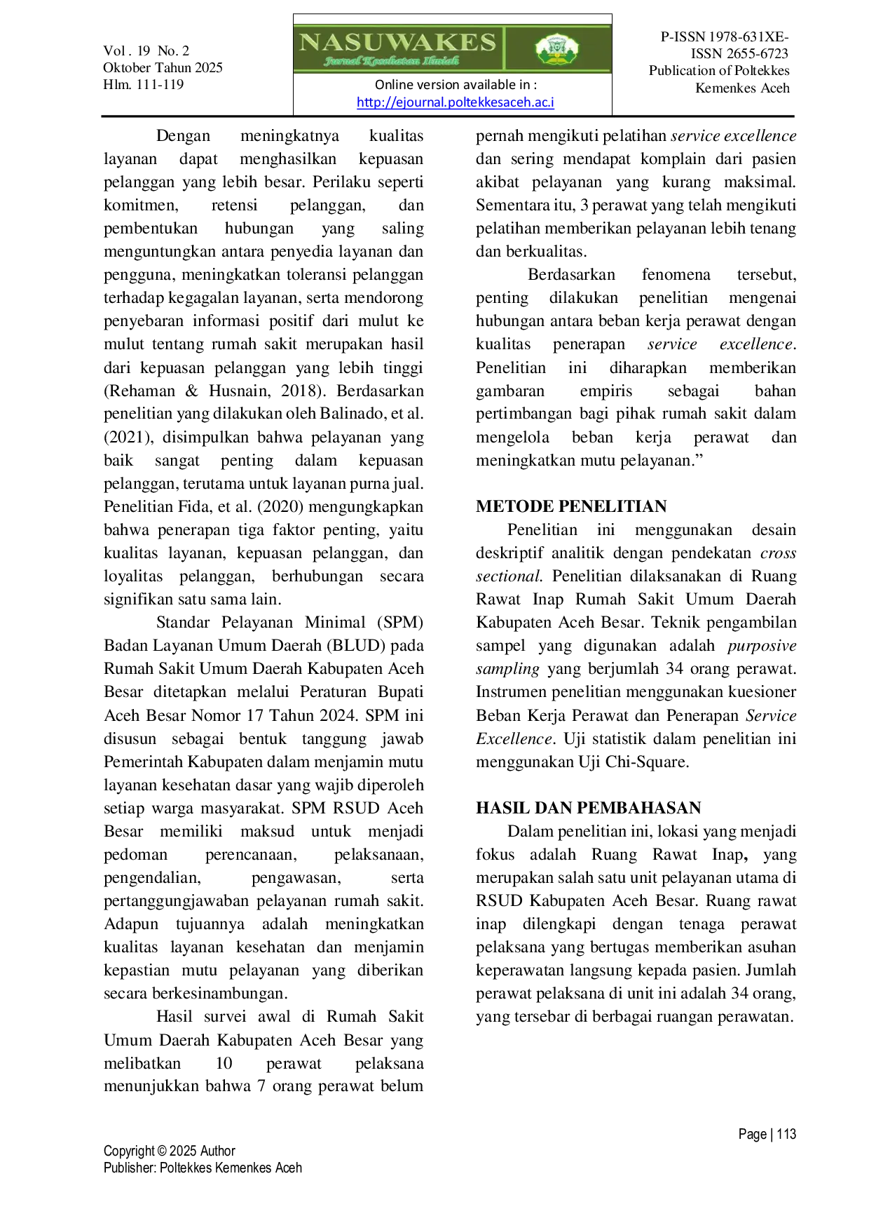 NASUWAKES: Jurnal Kesehatan IlmiahNASUWAKES: Jurnal Kesehatan IlmiahPerawat pelaksana memiliki peran strategis dalam menjamin mutu pelayanan keperawatan di rumah sakit. Beban kerja yang tinggi sering kali menjadi faktor yang dapat memengaruhi kualitas pelayanan yang diberikan, termasuk dalam penerapan service excellence. Penelitian ini menggunakan desain deskriptif analitik dengan pendekatan cross sectional. Populasi penelitian adalah seluruh perawat pelaksana di ruang rawat inap, dengan jumlah sampel sebanyak 34 orang yang dipilih melalui teknik purposive sampling. Instrumen yang digunakan berupa kuesioner beban kerja perawat dan penerapan service excellence. Analisis data dilakukan secara univariat untuk menggambarkan distribusi frekuensi, dan bivariat menggunakan uji Chi-Square untuk mengetahui hubungan antara beban kerja dengan penerapan service excellence. Hasil penelitian menunjukkan bahwa mayoritas perawat pelaksana berusia 31–35 tahun, berpendidikan Diploma III Keperawatan, dan telah bekerja kurang dari lima tahun. Sebagian besar memiliki beban kerja kategori berat (64,7%) dan kualitas penerapan service excellence pada kategori cukup (47,1%). Uji Chi-Square menghasilkan nilai p = 0,242 (>0,05), menandakan tidak ada hubungan signifikan antara beban kerja dengan penerapan service excellence, meskipun secara deskriptif terlihat kecenderungan bahwa semakin berat beban kerja, semakin rendah kualitas pelayanan prima yang diberikan. Kesimpulan dari penelitian ini secara keseluruhan, penelitian ini menegaskan pentingnya pengelolaan beban kerja yang proporsional guna mempertahankan kualitas pelayanan prima. Peningkatan kompetensi dan motivasi perawat melalui pelatihan berkelanjutan diharapkan dapat memperkuat penerapan service excellence meskipun dalam kondisi beban kerja yang tinggi.