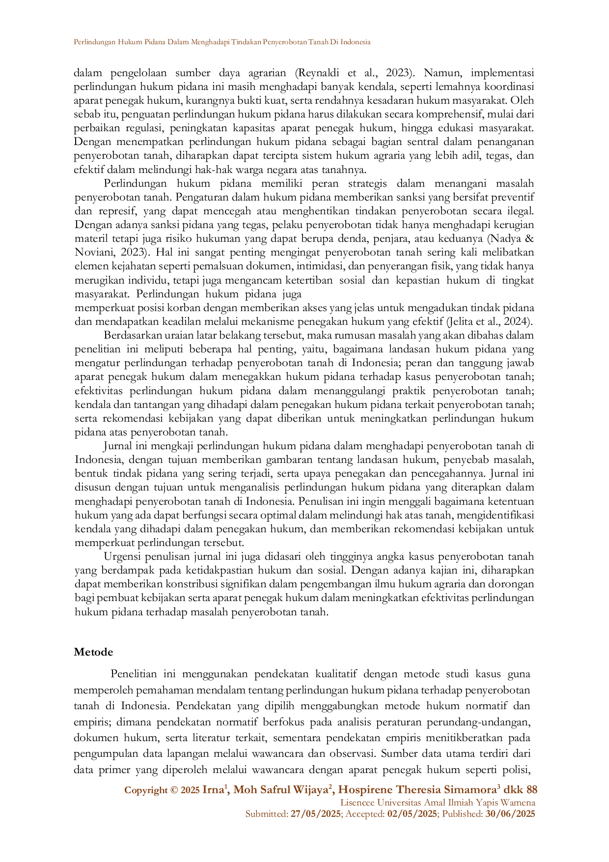 Jurnal HonaiJurnal HonaiPenyerobotan tanah tetap menjadi masalah agraria yang signifikan yang memengaruhi kepastian hukum dan kesejahteraan masyarakat di Indonesia. Penelitian ini bertujuan untuk menganalisis perlindungan hukum pidana yang berlaku pada kasus penyerobotan tanah, mengevaluasi peran aparat penegak hukum, menilai efektivitas penegakan hukum, serta mengidentifikasi hambatan dan tantangan yang dihadapi dalam penanganan kasus tersebut. Dengan menggunakan pendekatan yuridis normatif dan analisis data dari sumber primer maupun sekunder, hasil penelitian menunjukkan bahwa meskipun kerangka hukum pidana yang mengatur penyerobotan tanah sudah ada, pelaksanaannya menghadapi kesulitan seperti birokrasi yang kompleks, tumpang tindih kewenangan antar lembaga, serta lemahnya pengawasan internal yang dapat menyebabkan korupsi dan intervensi dari pihak berkepentingan. Oleh karena itu, harmonisasi regulasi, peningkatan kapasitas aparat penegak hukum, dan penguatan koordinasi antar lembaga sangat diperlukan untuk meningkatkan efektivitas perlindungan hukum. Selain itu, pemberdayaan masyarakat dan sistem informasi pertanahan yang transparan menjadi faktor penting dalam mendukung penegakan hukum yang adil dan optimal. Penelitian ini memberikan rekomendasi kebijakan yang dapat dijadikan pedoman untuk memperkuat perlindungan hukum pidana terhadap penyerobotan tanah di Indonesia.