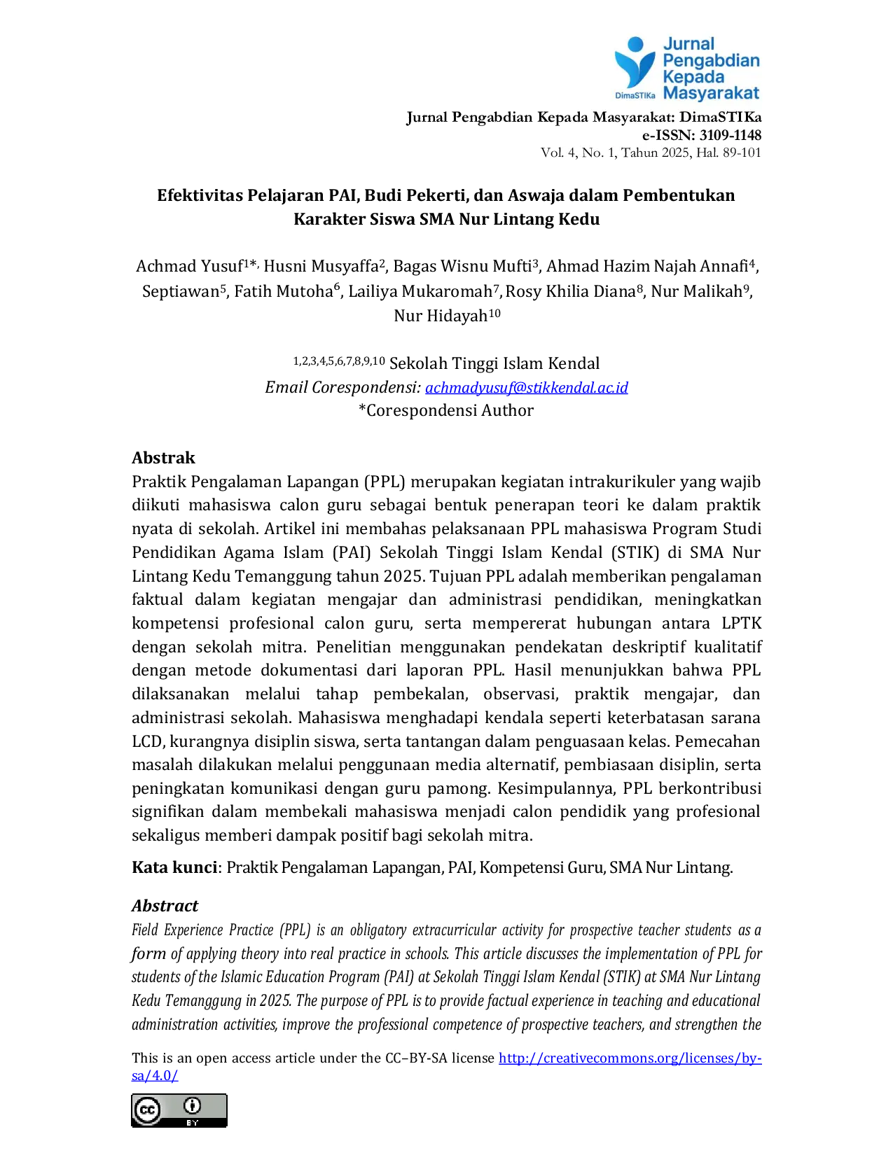 Jurnal Pengabdian Kepada MasyarakatJurnal Pengabdian Kepada MasyarakatPraktik Pengalaman Lapangan (PPL) adalah kegiatan intrakurikuler wajib bagi calon guru untuk menerapkan teori ke praktik nyata di sekolah. Artikel ini membahas pelaksanaan PPL mahasiswa Pendidikan Agama Islam (PAI) Sekolah Tinggi Islam Kendal (STIK) di SMA Nur Lintang Kedu Temanggung tahun 2025. Tujuan PPL adalah memberikan pengalaman faktual dalam mengajar dan administrasi pendidikan, meningkatkan kompetensi profesional calon guru, serta mempererat hubungan antara LPTK dan sekolah mitra. Penelitian menggunakan pendekatan deskriptif kualitatif dengan metode dokumentasi dari laporan PPL. Hasil menunjukkan bahwa PPL dilaksanakan melalui tahap pembekalan, observasi, praktik mengajar, dan administrasi sekolah. Mahasiswa menghadapi tantangan seperti terbatasnya sarana LCD, kurangnya disiplin siswa, dan tantangan dalam penguasaan kelas. Pemecahan masalah dilakukan melalui penggunaan media alternatif, pembiasaan disiplin, serta peningkatan komunikasi dengan guru pamong. Kesimpulannya, PPL berkontribusi signifikan dalam membekali mahasiswa menjadi calon pendidik profesional sekaligus memberi dampak positif bagi sekolah mitra.