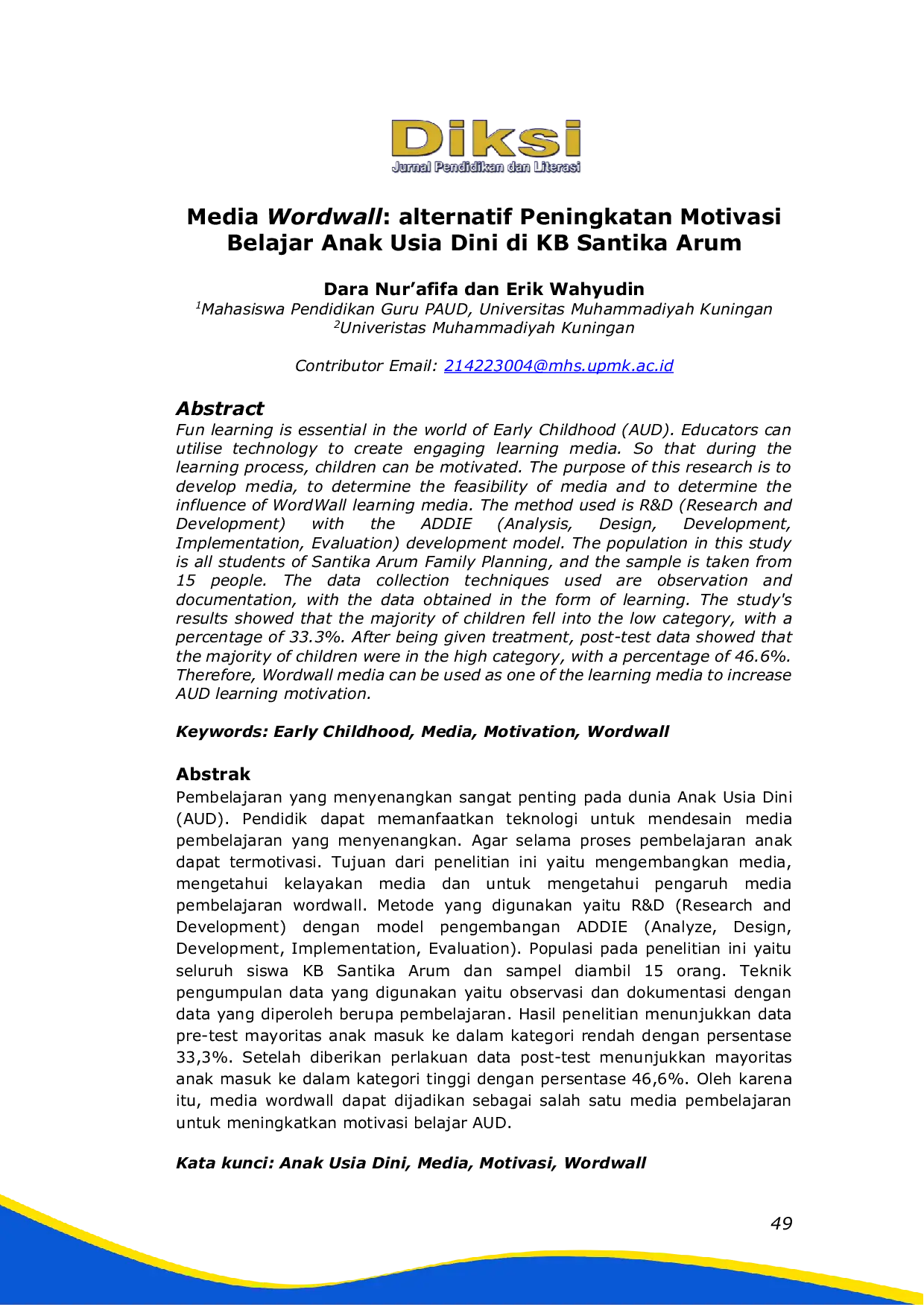 Diksi: Jurnal Pendidikan dan LiterasiDiksi: Jurnal Pendidikan dan LiterasiPembelajaran yang menyenangkan sangat penting pada dunia Anak Usia Dini (AUD). Pendidik dapat memanfaatkan teknologi untuk mendesain media pembelajaran yang menyenangkan. Agar selama proses pembelajaran anak dapat termotivasi. Tujuan dari penelitian ini yaitu mengembangkan media, mengetahui kelayakan media dan untuk mengetahui pengaruh media pembelajaran wordwall. Metode yang digunakan yaitu R&D (Research and Development) dengan model pengembangan ADDIE (Analyze, Design, Development, Implementation, Evaluation). Populasi pada penelitian ini yaitu seluruh siswa KB Santika Arum dan sampel diambil 15 orang. Teknik pengumpulan data yang digunakan yaitu observasi dan dokumentasi dengan data yang diperoleh berupa pembelajaran. Hasil penelitian menunjukkan data pre-test mayoritas anak masuk ke dalam kategori rendah dengan persentase 33,3%. Setelah diberikan perlakuan data post-test menunjukkan mayoritas anak masuk ke dalam kategori tinggi dengan persentase 46,6%. Oleh karena itu, media wordwall dapat dijadikan sebagai salah satu media pembelajaran untuk meningkatkan motivasi belajar AUD.