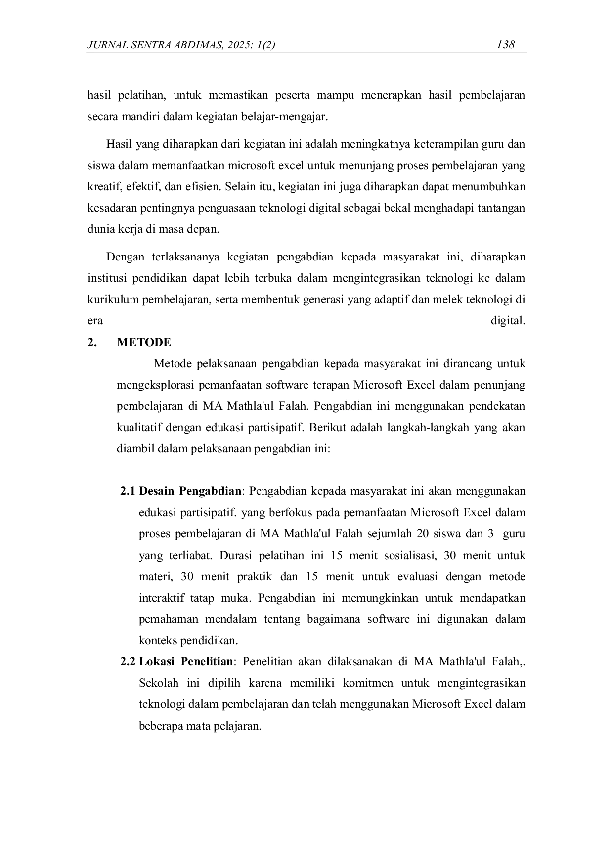 SENTRA ABDIMAS: Sinergi dan Transformasi dalam Pengabdian kepada MasyarakatSENTRA ABDIMAS: Sinergi dan Transformasi dalam Pengabdian kepada MasyarakatDi era digital saat ini, pemanfaatan teknologi informasi dalam proses pembelajaran menjadi sangat penting. Microsoft Excel, sebagai salah satu software terapan yang populer, masih belum dimanfaatkan secara optimal oleh siswa. Pengabdian ini menggunakan pendekatan kualitatif dengan metode studi kasus untuk mengeksplorasi pemanfaatan Microsoft Excel sebagai alat bantu dalam proses pembelajaran.